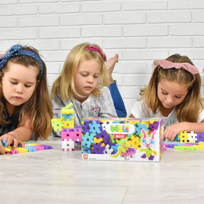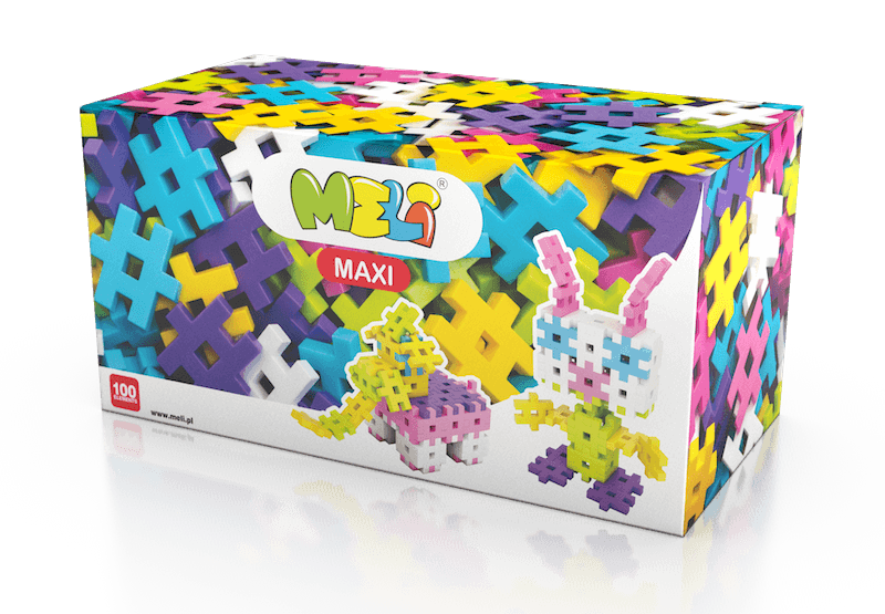 - A large set of Meli Maxi bricks in a pretty purple and pink color scheme will be a perfect gift for a little builder. The set contains 100 pieces sized to fit the hands of smaller children. Instructions in booklet form included.