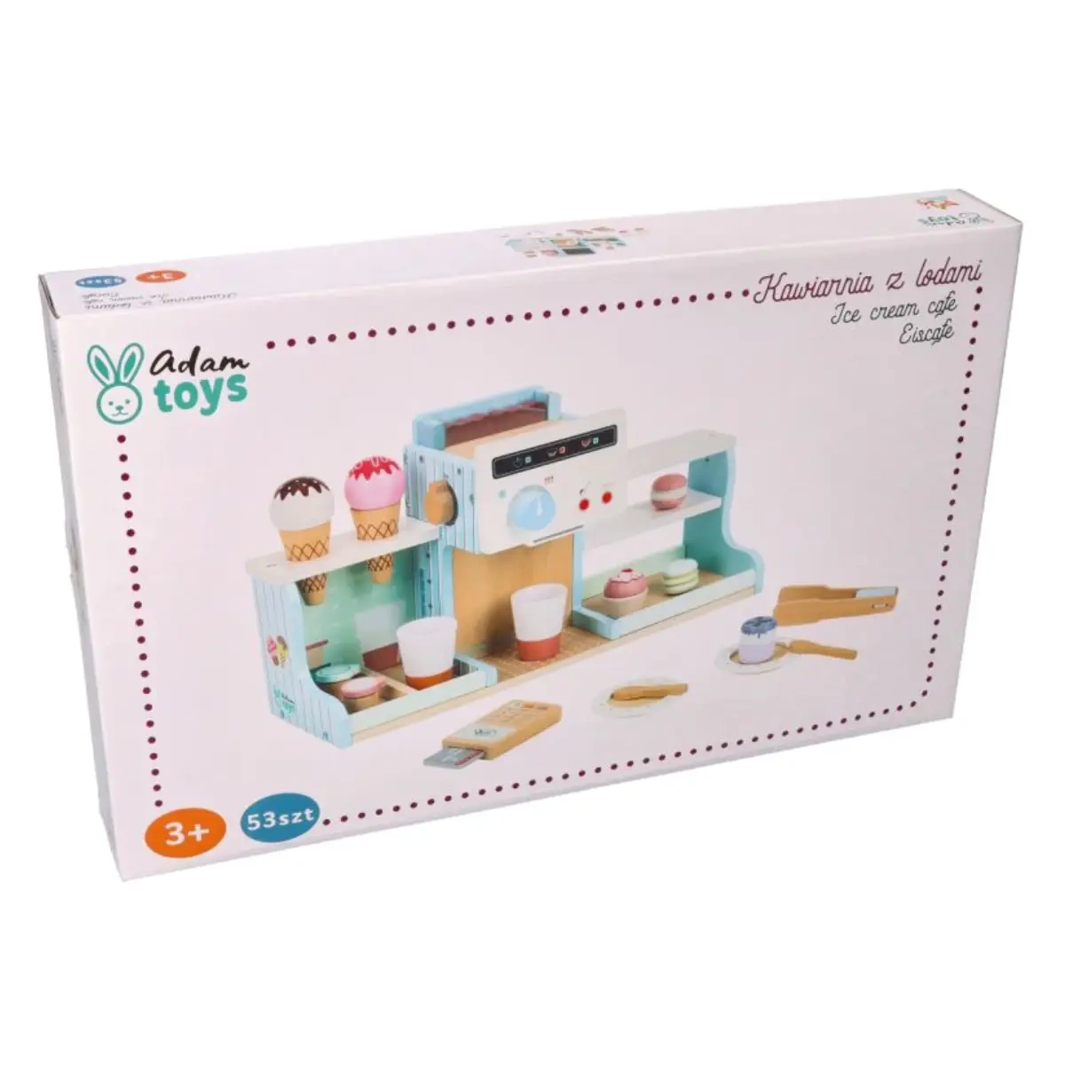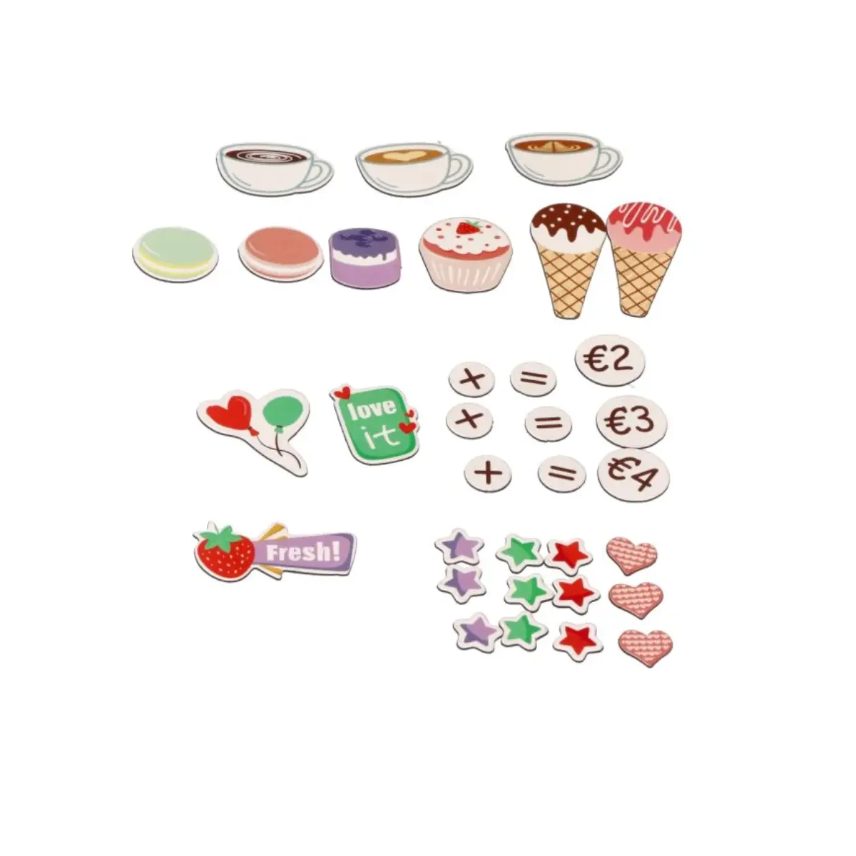 Set supports learning to communicate, count and distinguish colors. It allows children to develop independence, self-confidence and teaches them how the world of services works. Playing ice cream and cafe together fosters relationships with family and friends and stimulates logical thinking, planning and problem solving. In addition, it inspires learning the names of products, develops vocabulary and language competence, which is appreciated by both parents and professionals.
