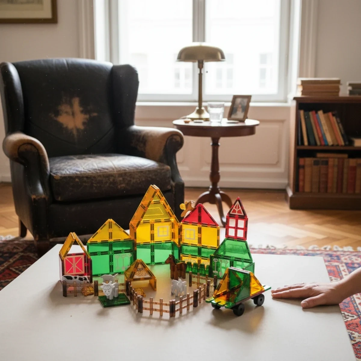 Unlike basic magnetic tile sets, this farm-themed collection brings rural life to your living room floor. Semi-transparent tiles in warm amber, green, and red connect magnetically along their green-edged borders, creating barns, stables, and gated enclosures. Printed tile inserts — barn doors, farming tools, window grilles — add authentic detail without extra stickers.