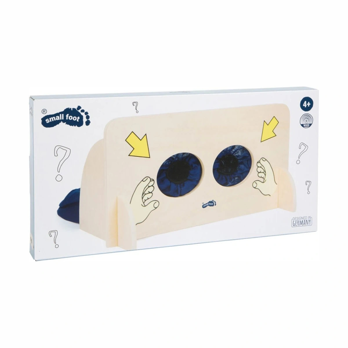 Legler Magic Sensory Wall is a wooden-and-fabric sensory toy for children ages 3+ that develops tactile perception and hand-eye coordination. Kids insert their hands through openings and guess hidden objects by touch alone.
