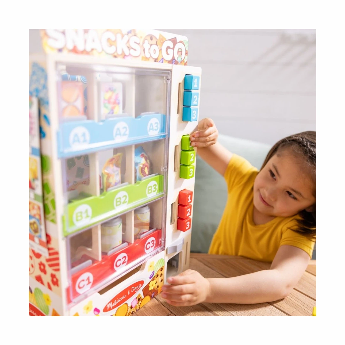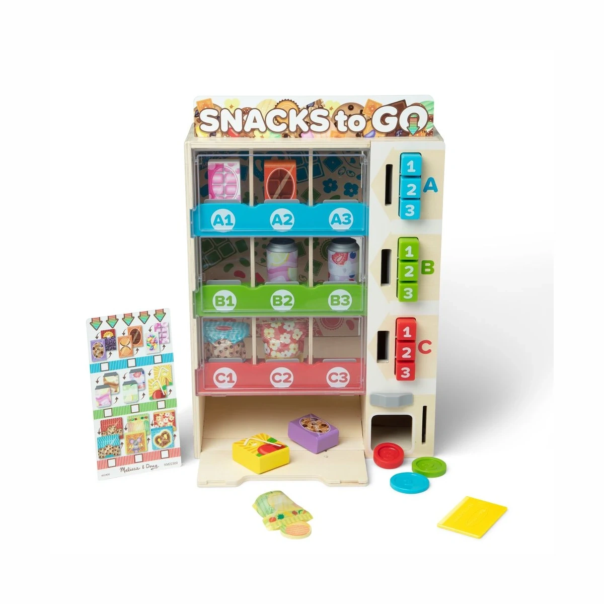 - The Melissa & Doug Snack Vending Machine is a fantastic way to learn through pretend shop play. The set includes a machine with coins, a credit card and snacks. Your child will learn A1-C3 codes while practicing coordination and imagination. For children