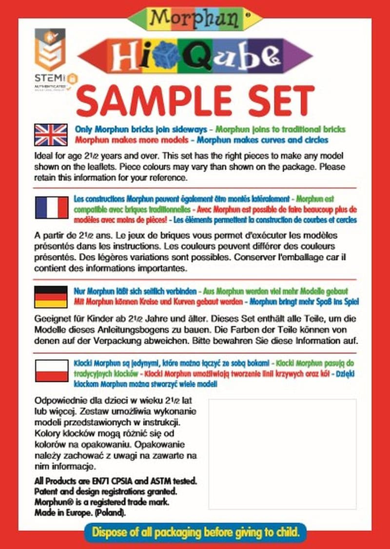 A set of Hi-Qube bricks are interesting educational toys for a 3 year old, which will positively influence the intellectual development of our child. The set contains 25 pieces of various shapes and nice, saturated colors. A distinctive feature of the toy is the presence of triangular elements, connectors and wheels, ensuring safe play. Creative toys for a 3 year old to an excellent solution for the child to develop creative thinking and spatial imagination. It's also a good gift idea. The set also includes illustrated instructions. We also recommend our other plastic blocks!The kit comes with full-color step-by-step instructions printed on A4 chalk paper.