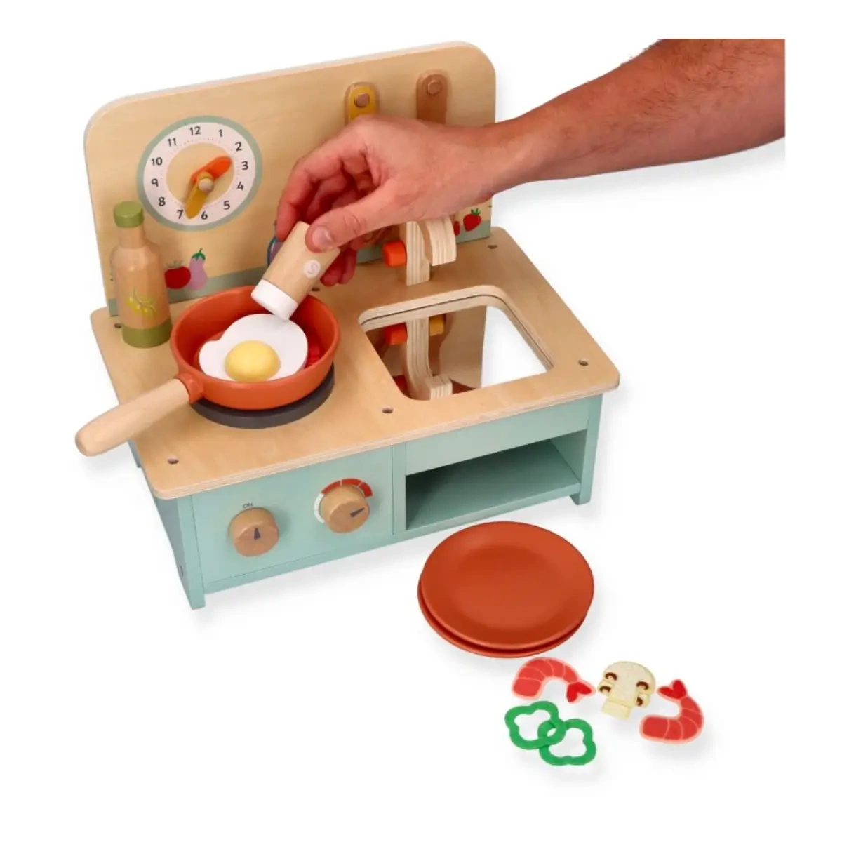 - Compact wooden kitchen with 12 accessories for children 3+. Clicking dials, clock, sink with faucet and realistic utensils develop creativity and motor skills. Made of CE-certified safe wood. The perfect first kitchen for toddlers.