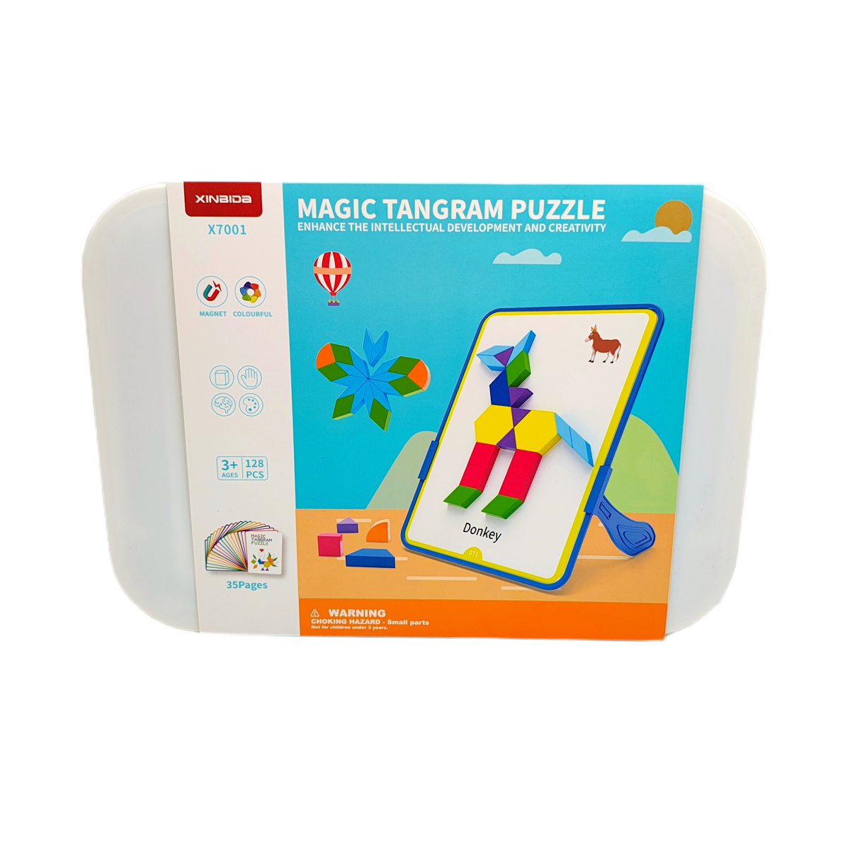 Magnetic Tangram is an interesting proposal of building blocks with a very long history. Tangram is an ancient Chinese puzzle - a puzzle from almost 3000 years ago. Nowadays, this simple game has been enhanced by the addition of magnets to the blocks - making it so much easier to build. Thanks to these magnets, models are durable and, in addition, blocks can be combined into spatial constructions. Multicolored elements can additionally be used for dozens of other math games - such as grouping shapes and colors, sorting, or learning to add and subtract. The set additionally includes eye and mouth stickers that blandly "enliven" the created models.
