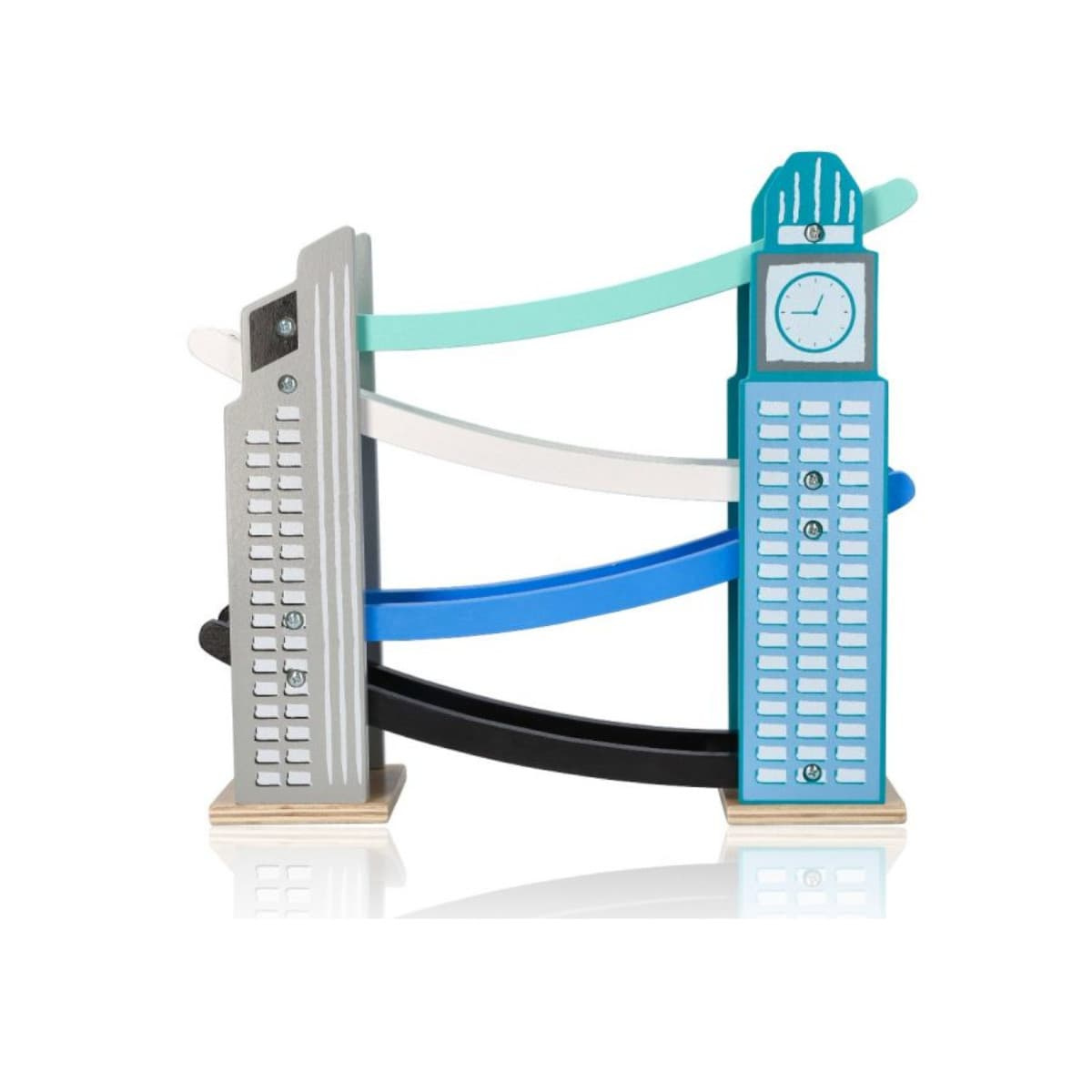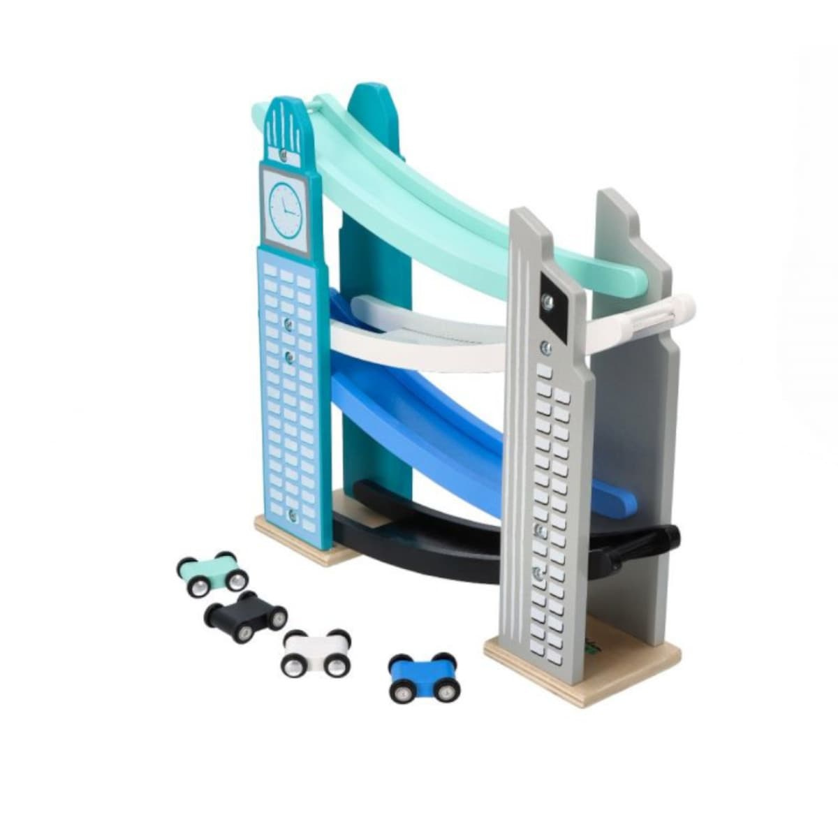 Welcome to the fascinating world of urban adventures! Car slide - Skyscraper is not just a toy - it's a gateway to an exciting world, where two majestic skyscrapers reach for the sky, and between them plays out an incredible adventure! Designed for little explorers from 18. months old, this unusual design combines the magic of play with modern design. Any little car fan will be delighted! Each of the four levels of this urban adventure is a separate story. Mint, white, blue and black colored tracks guide cars through a thrilling journey downhill. It's not just fun - it's learning colors, space and physics in its purest form. Small drivers can experiment, discovering which track is the fastest and which car will get the farthest.Refined in every detail toy guarantees toddlers a huge a lot of fun and joy and turns a child's room into a modern urban metropolis. Geometric shapes of towers, distinctive clock and minimalist details make the toy a real decoration of the space, attracting the eye and encouraging children to get acquainted with the toy.