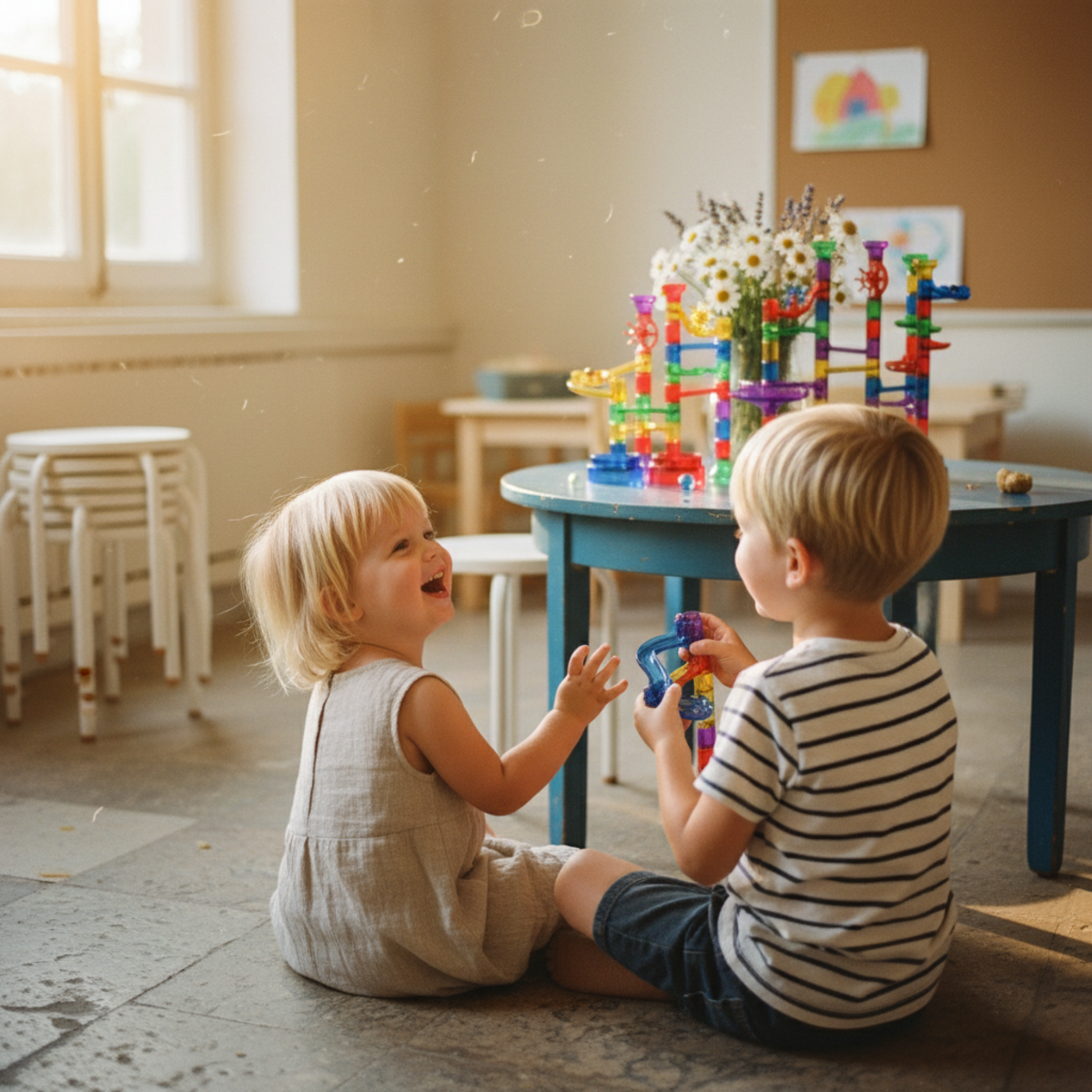What skills does a marble run develop? It builds logical and cause-and-effect thinking, fine motor skills, spatial planning, concentration, and introduces basic physics such as gravity and motion.