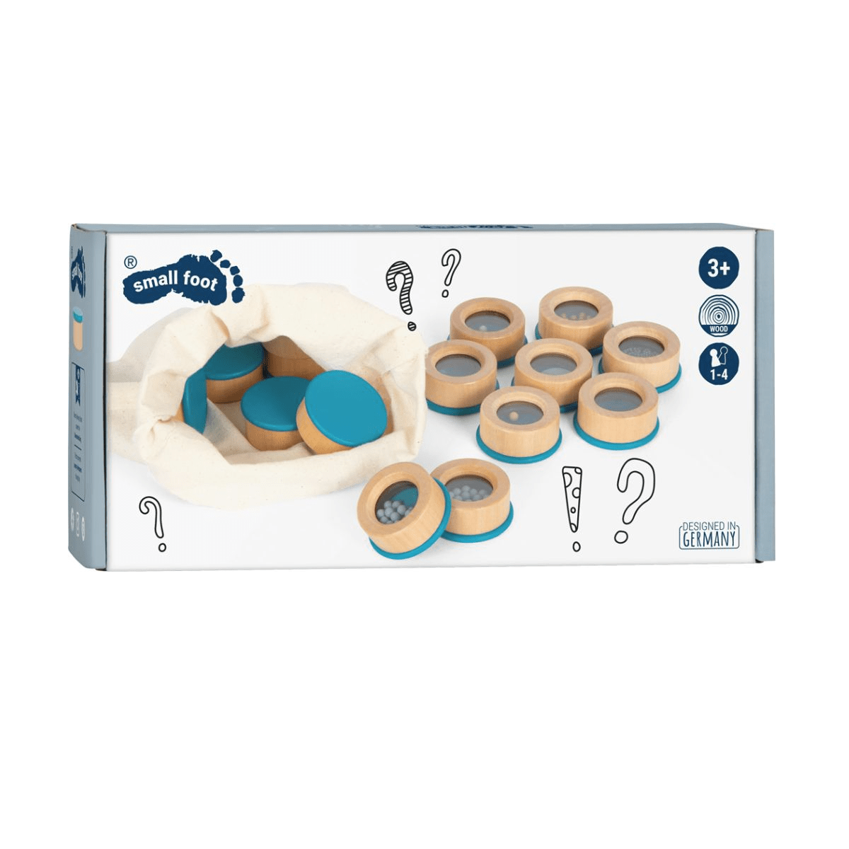 The set includes 16 wooden discs filled with balls in varying amounts and made in different materials such as plastic, wood and metal. As a result, when shaken, each pair makes a different sound. At the bottom of each item there is a transparent window where you can see what type of item is inside.