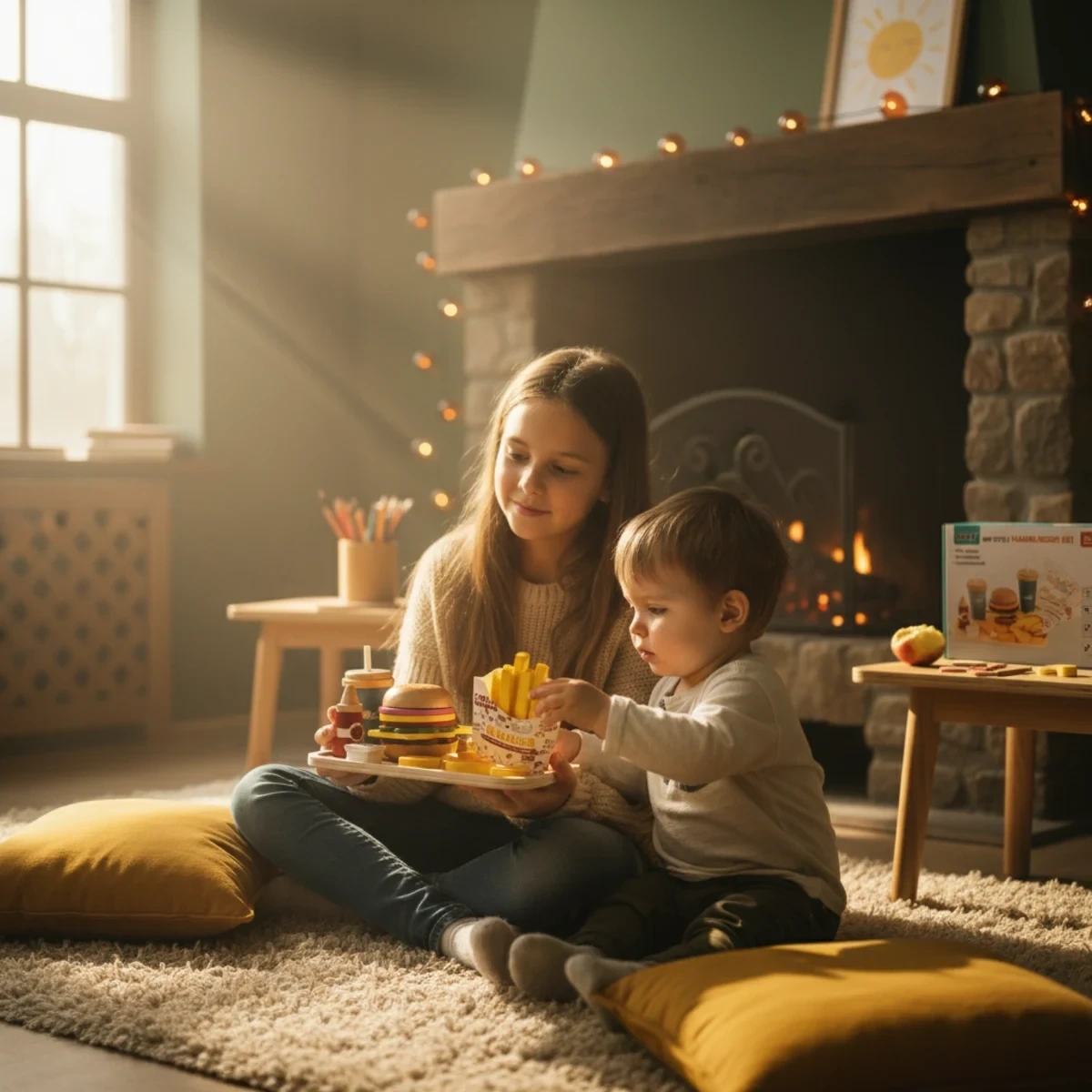 - A colorful wooden fast food role-play set with a layered burger, fries, chicken, cola cup, sauces and a menu card – 20+ bright pieces that develop fine motor skills, hand-eye coordination, and imagination in children aged 3 and up.