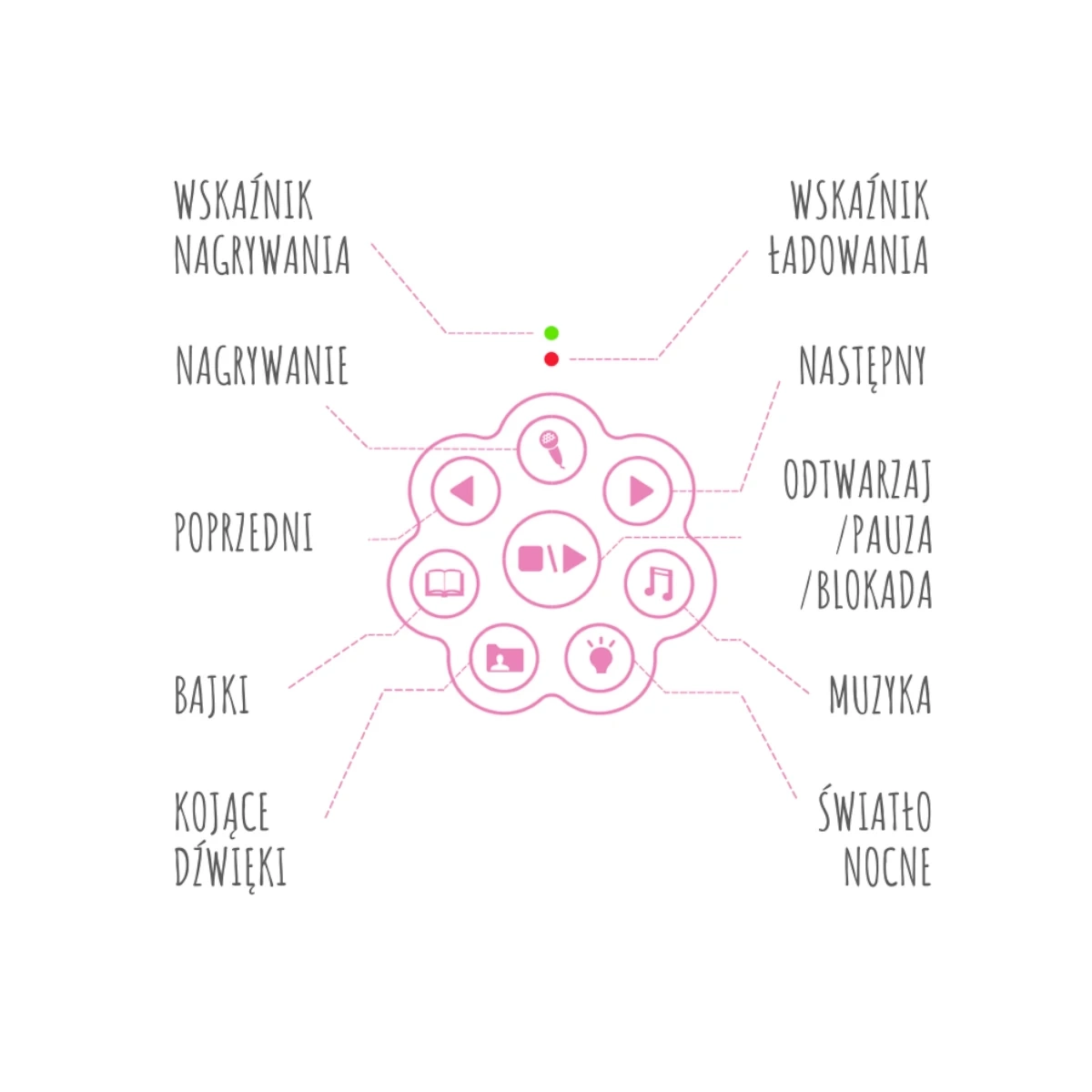 The pink bunny includes pre-installed polish and English songs, lullabies and fairy tales, complemented by calming white noise and classical compositions. This is a real treasure trove of sounds to support a child's linguistic, musical and emotional development.