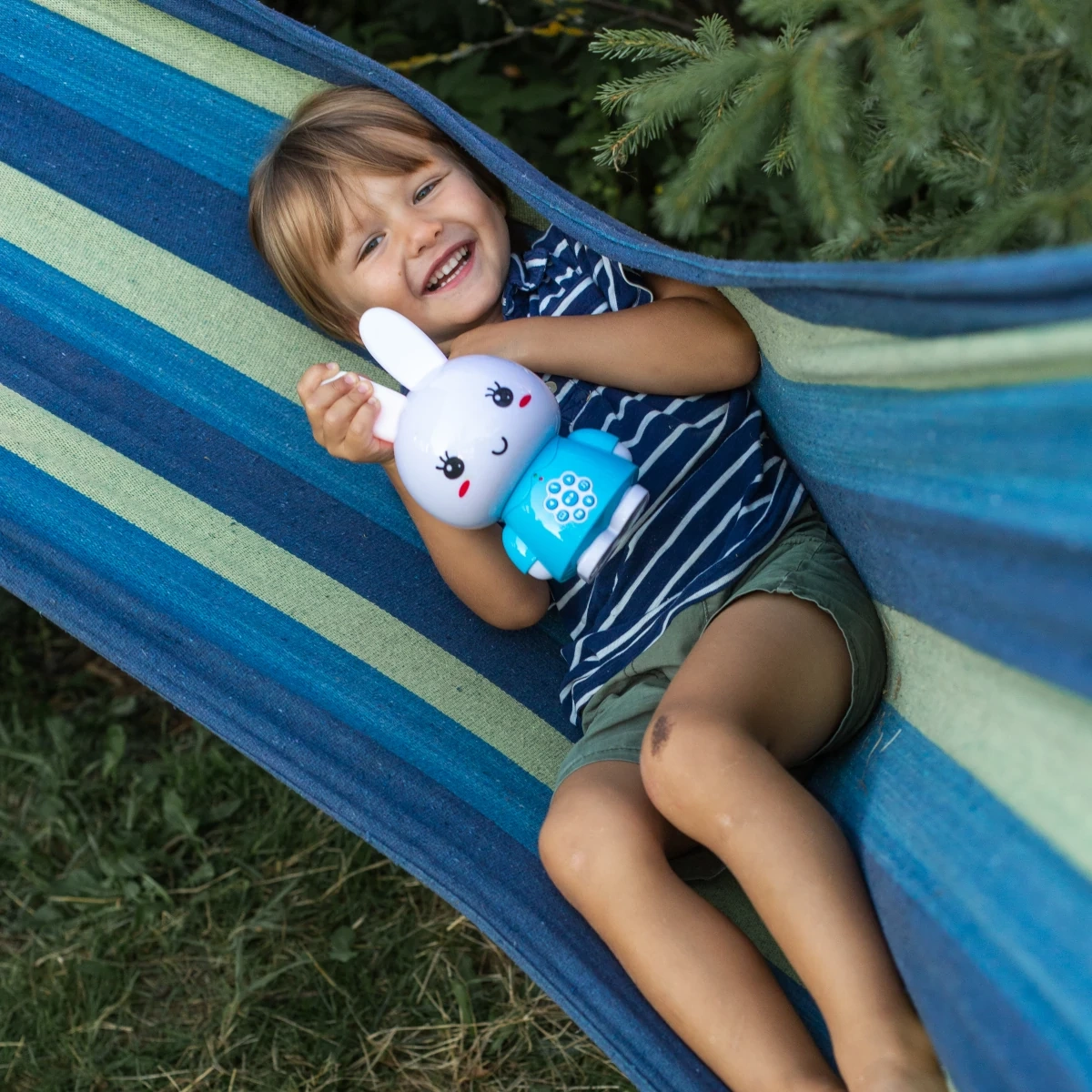 Treat your little one to an extraordinary companion that harmoniously combines educational entertainment with a calming sleeping companion. This versatile bunny in an adorable pink color is not only a cuddly mascot, but also a mP3 player,recorder and bedside lamp! Beloved by parents on all continents, honored in Poland with the prestigious title of Toy of the Year 2015 in the segment of Interactive Toys.