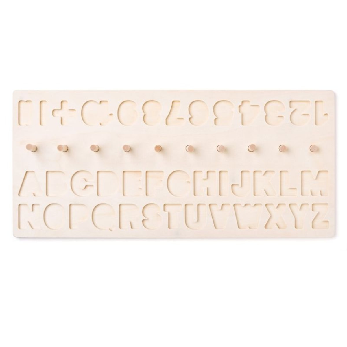 - The set contains 104 elements: a wooden board with indentations (50 x 23 x 2.5 cm), colorful letters of the alphabet from A to Z (26 pieces.), numbers from 1 to 10, signs "+", "-", "=", 10 wooden stakes, 55 colored discs in different shades