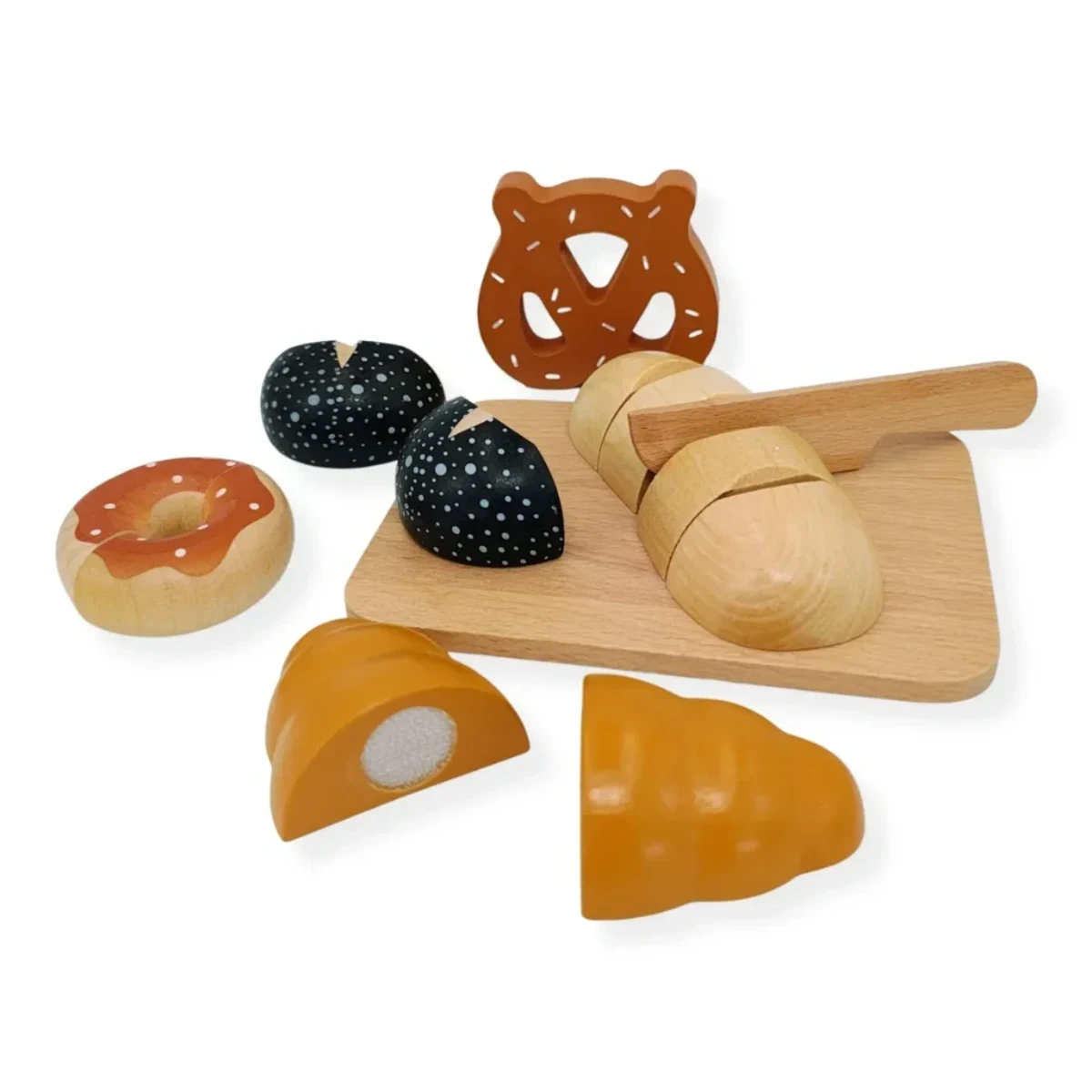 • ▸ 7 elementów: bochenek, rogalik, pączek, precel, bułka + deska + nóż