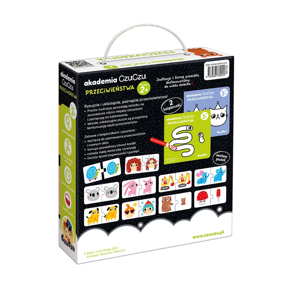 - Edukacyjny zestaw z puzzlami i książeczkami do kolorowania. Uczy przeciwieństw przez zabawę. Rozwija logiczne myślenie, motorykę i słownictwo u dzieci 2+. Wytrzymałe materiały, bezpieczne farby. Idealna zabawa rodzinna.