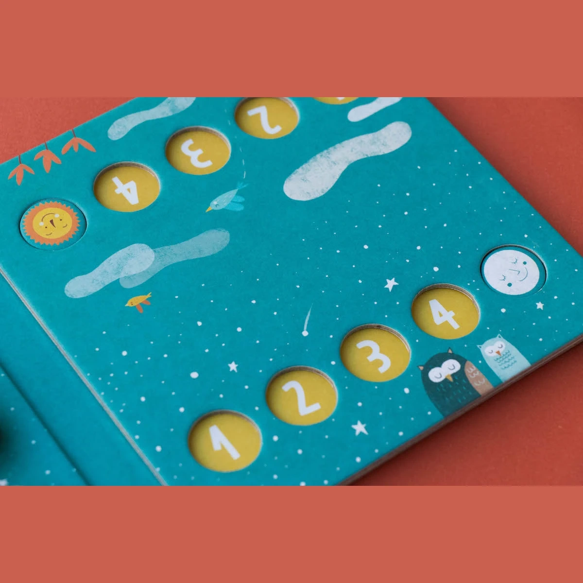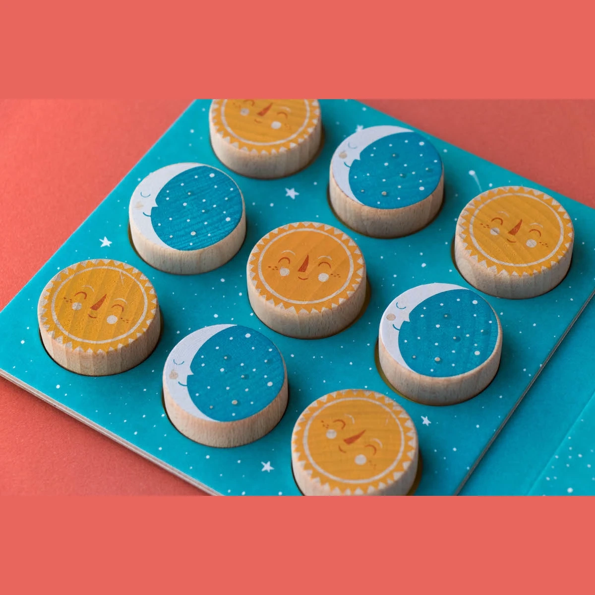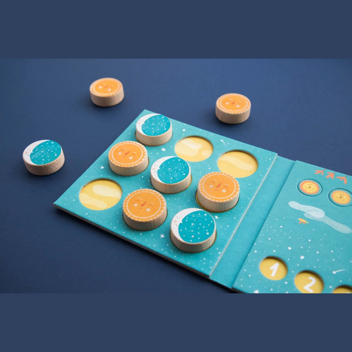 W środku zgrabnego tekturowego pudełka zamykanego na gumkę (wymiary 16,4 x 16,4 x 2,5 cm) czeka drewniana plansza z 9 krążkami o średnicy 4 cm – 8 do gry plus 1 zapasowy. Przeciwstawne motywy słońca i księżyca w ciepłych, retro kolorach to nie tylko pionki, ale miniaturowe dzieła ilustratorskie. Po drugiej stronie opakowania znajdują się tekturowe punkty do zliczania wygranych, dzięki czemu każda rozgrywka może zamienić się w turniejową serię pełną emocji.