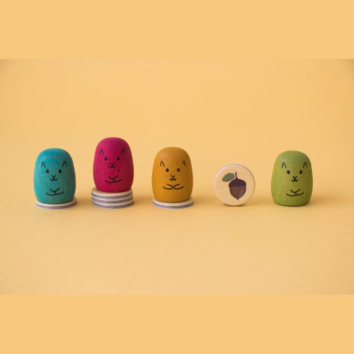 - Liczba elementów: plansza dwustronna, 8 drewnianych wiewiórek (4 kolory po 2 sztuki), 24 żetony z żołędziami, 1 kostka do gry