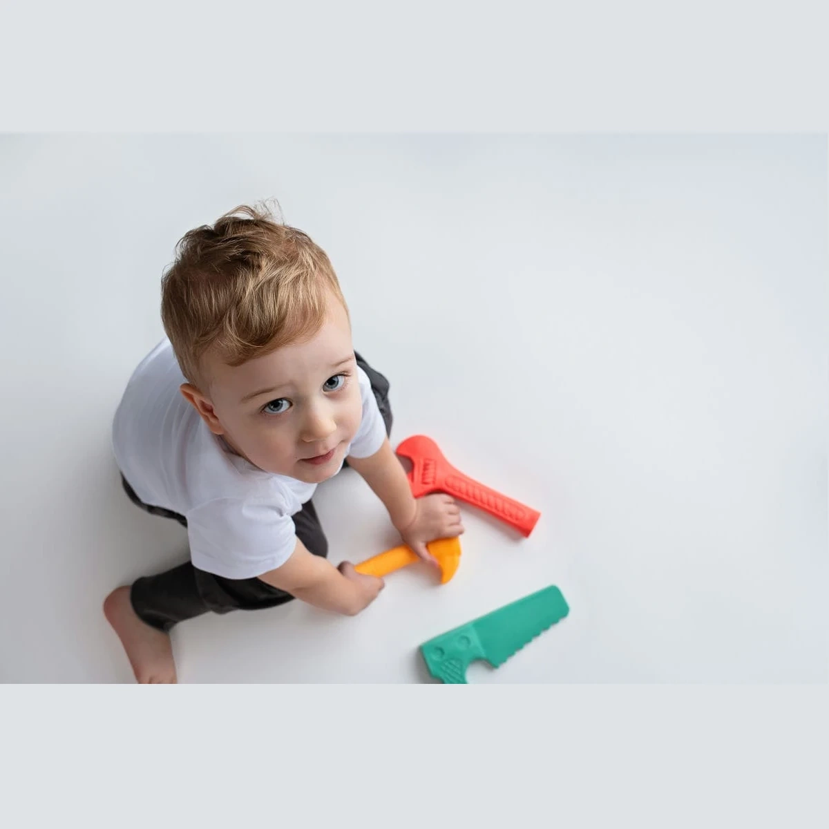 - Kolorowa zabawka sensoryczna, która rozwija zmysły i małą motorykę malucha. Bezpieczna alternatywa dla prawdziwych narzędzi, Wspiera kreatywność i wszechstronny rozwój już od 10 miesiąca życia.
