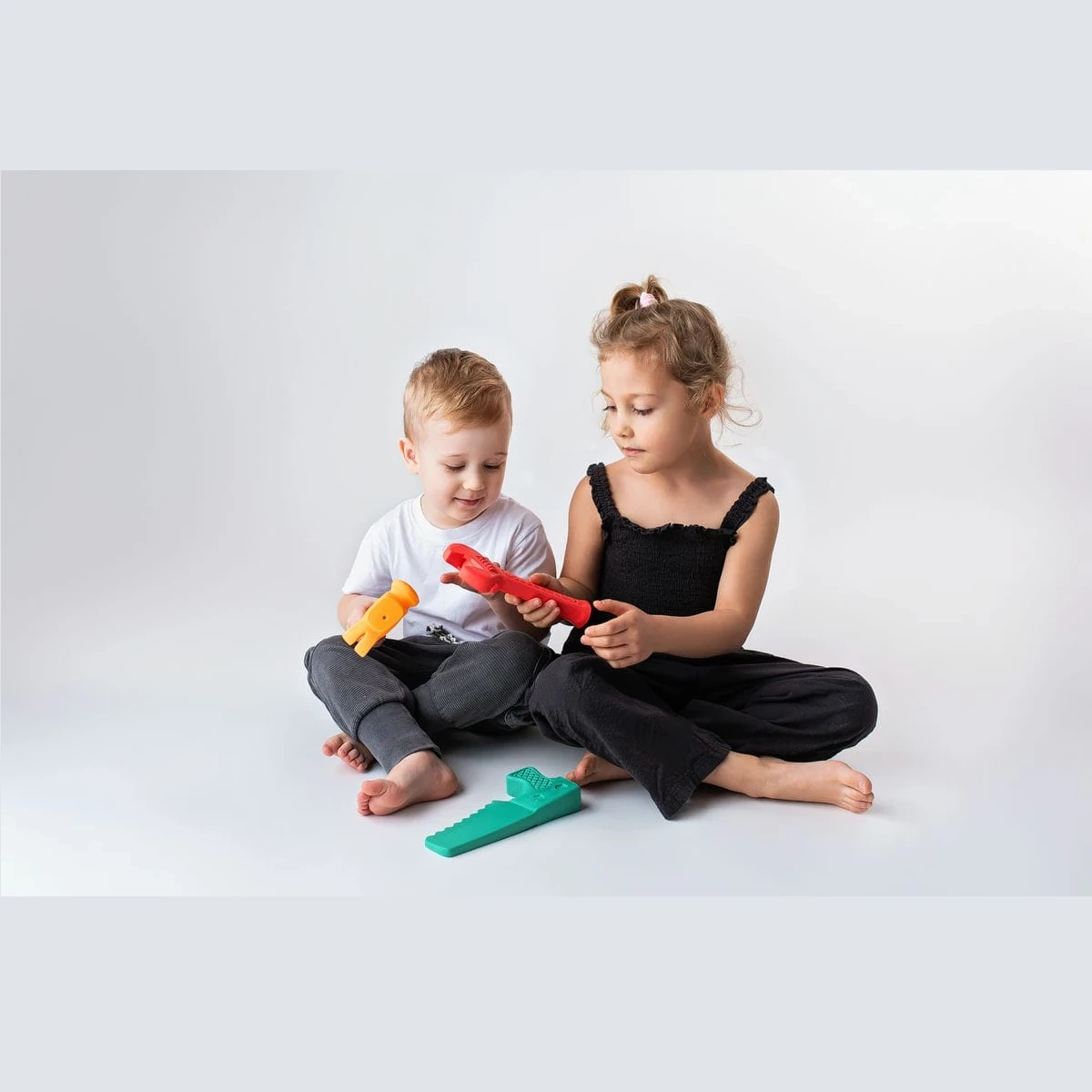 Nasze miękkie narzędzia sensoryczne to znacznie więcej niż zwykła zabawka – to kompleksowe narzędzie wspierające prawidłowy rozwój Twojego dziecka na wielu płaszczyznach. Specjalnie zaprojektowane wypustki i zróżnicowane faktury intensywnie stymulują zmysł dotyku, co jest kluczowe dla prawidłowego rozwoju układu nerwowego. Chwytanie, ściskanie i manipulowanie miękkimi narzędziami doskonale ćwiczy małą motorykę, wzmacnia mięśnie dłoni i poprawia koordynację oko-ręka.