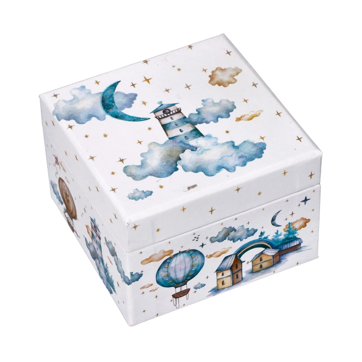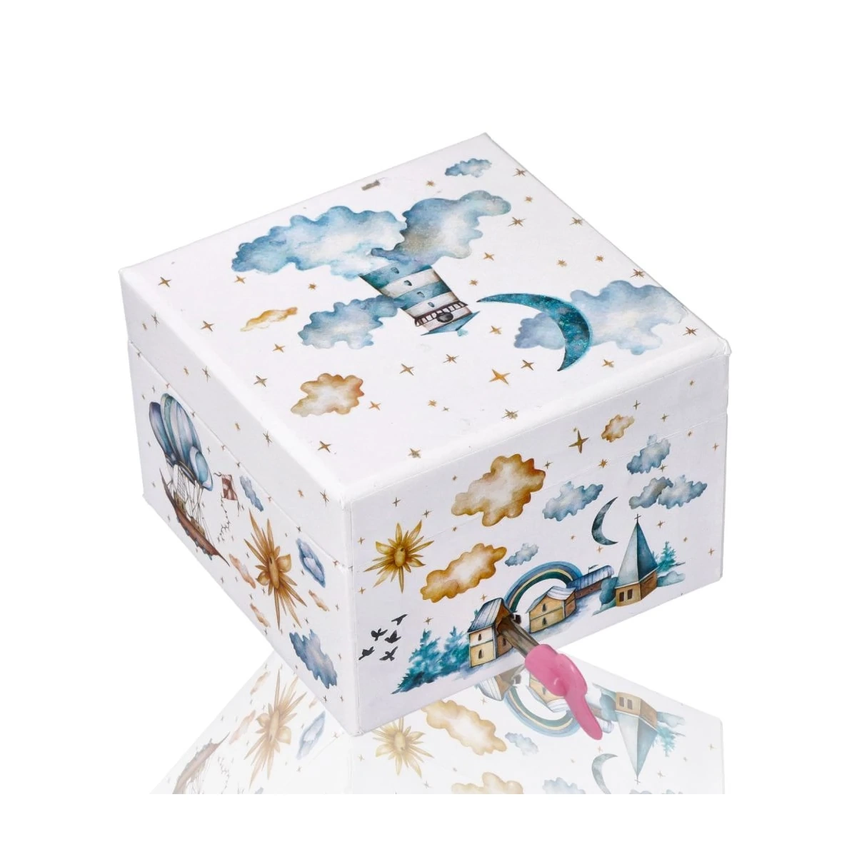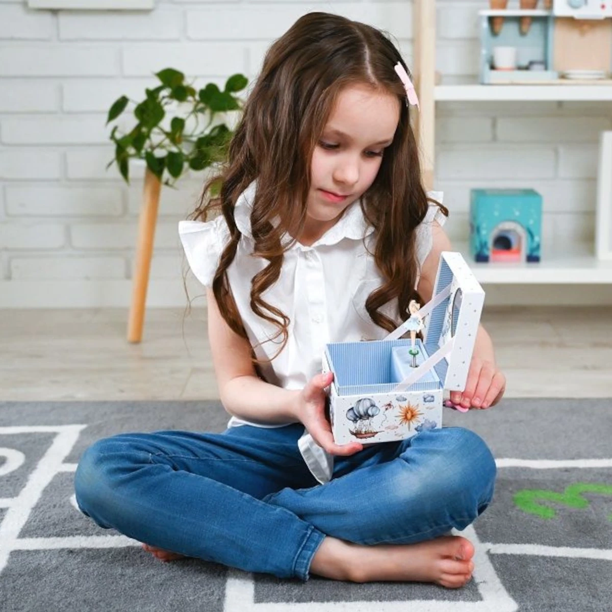 Mechanizm nakręcany bez baterii gwarantuje ekologiczne rozwiązanie i nieprzerwaną zabawę. Wystarczy przekręcić pokrętło z tyłu pozytywki, aby baletnica zaczęła wirować w rytm klasycznej melodii. Lusterko w kształcie serduszka dodaje uroku i funkcjonalności – idealne do pierwszych prób makijażu czy przygotowań do występów teatralnych. Motywy latarni morskiej, chmurek i balonów tworzą uspokajającą atmosferę sprzyjającą wieczornym rytuałom przed snem.