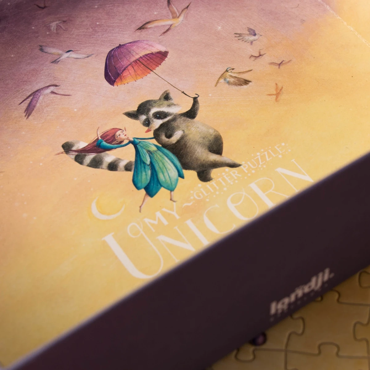 Puzzle „Mój Jednorożec” 350 elementów marki Londji to niezwykła układanka stworzona z myślą o dzieciach marzących o magicznych przygodach. Każdy element został ozdobiony efektownym brokatem, co podkreśla wyjątkowy charakter produktu i zachęca do kreatywnej zabawy. Ilustracje Sonji Wimmer łączą starannie dopracowaną grafikę z baśniowym klimatem, rozbudzając wyobraźnię oraz przenosząc dziecko do świata jednorożców i fantastycznych zwierząt. Ta propozycja idealnie wpisuje się w najnowsze trendy edukacyjne i kreatywne na rynku zabawek.
