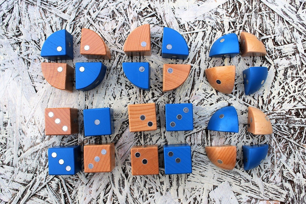 - W skład klocków magnetycznych IGEO wchodzą 24 drewniane elementy, z których skonstruować można wiele prostych konstrukcji. Swoim kształtem przypominają kostki do klasycznych gier planszowych – jednak te w zestawie można ze sobą łączyć!