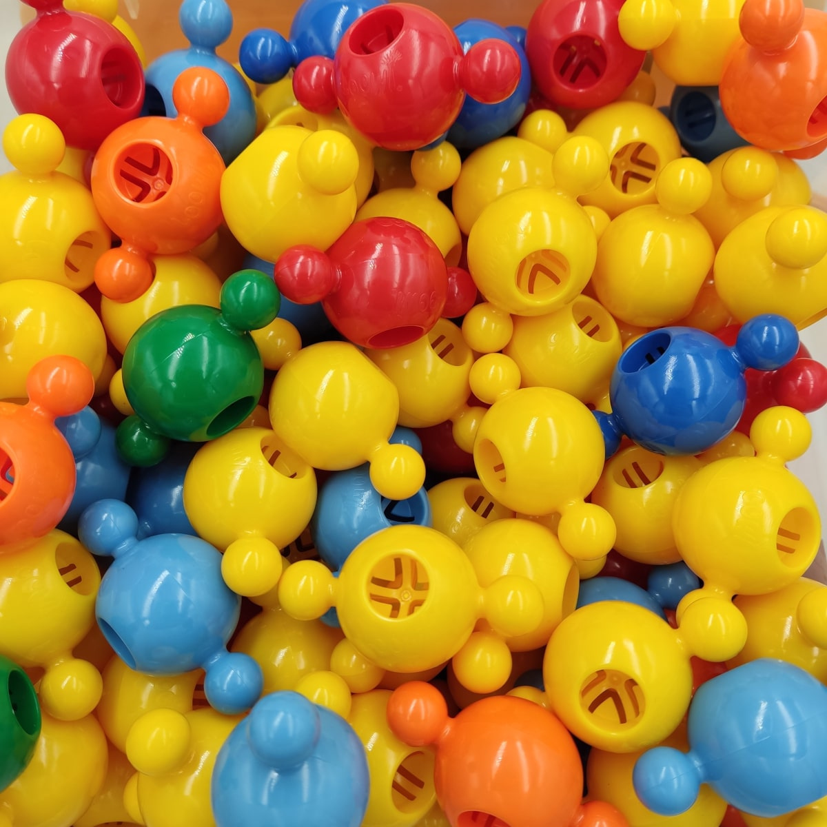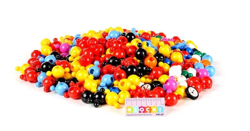 • Klocki zostały zaprojektowane tak, aby stymulować rozwój dziecka. Maluch z łatwością połączy ze sobą kolorowe kulki wykonane z wysokiej jakości materiału i dostosowane wielkością do jego rączek. W zestawie 10 instrukcji A4. Całość w praktycznym pudełku.