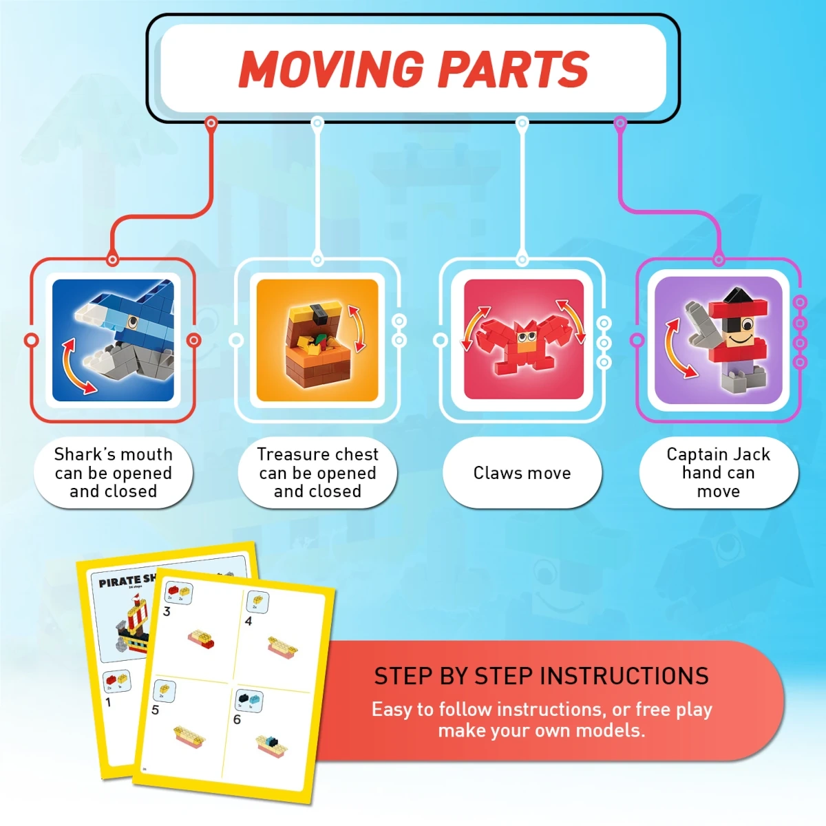 - Zestaw zawiera aż 335 kolorowych klocków w pirackim stylu! Statek piracki, piraci, rekiny, wyspa ze skarbem. Wysoka australijska jakość dla dzieci 4+. Rozwija wyobraźnię, motorykę i logiczne myślenie. Całość w praktycznym zamykanym pudelku.