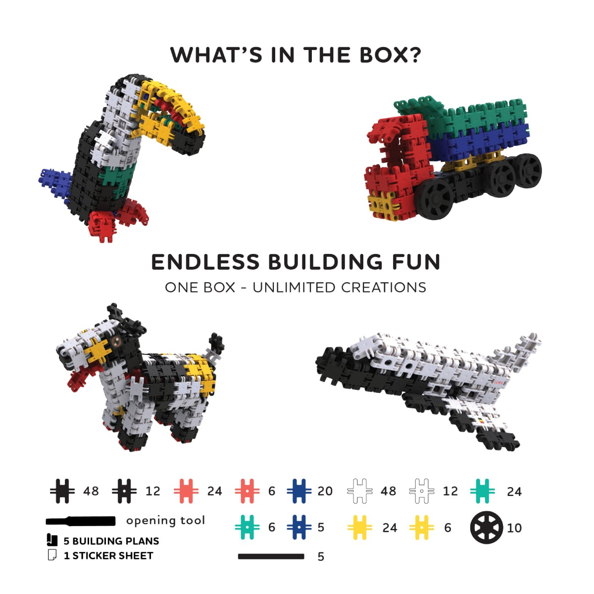 250 miniaturowych elementów konstrukcyjnych w różnych kolorach i kształtach. Instrukcja do budowy modeli. Duża baza do ambitnych projektów!