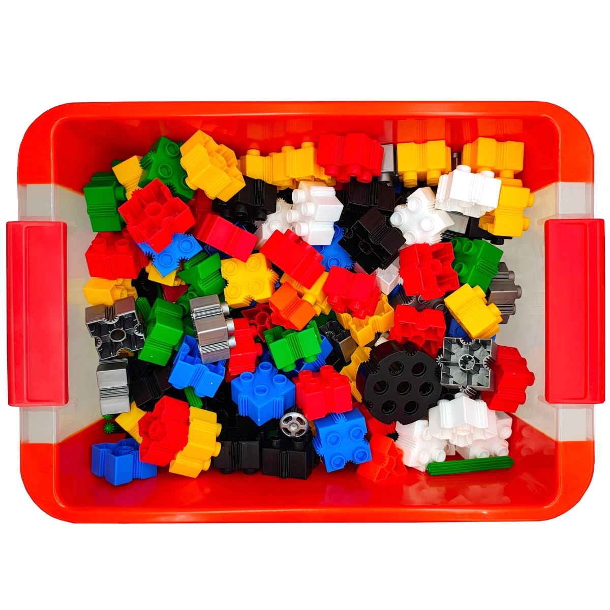 Co zawiera zestaw? 400 elementów konstrukcyjnych, koła obrotowe i kolorową spiralną instrukcję.
