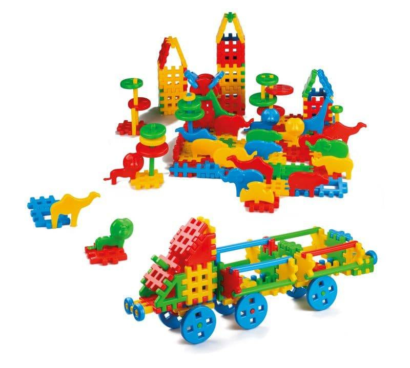 Zestaw zawierający aż 200 różnych elementów. Elementy o wymiarach od 4,5 cm - 22 cm dają wiele możliwości tworzenia. Tym co odróżnia ten zestaw klocków od innych, to z pewnością dodatkowe elementy. Elementy takie, jak małe i duże koła, osie, postacie, figurki zwierząt, mocno urozmaicają dzieciom zabawę. Małe pociechy mogą stworzyć własną historię zabawy budując jednoczenie, samochód, dom ze zwierzętami w ogródku i postaciami. Z zestawu z tak dużą ilością elementów, jedynym ograniczeniem będzie dziecięca wyobraźnia. Kolorystyka klocków już od początku wzbudza zainteresowanie małych pociech.