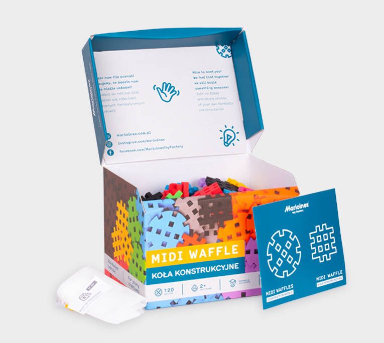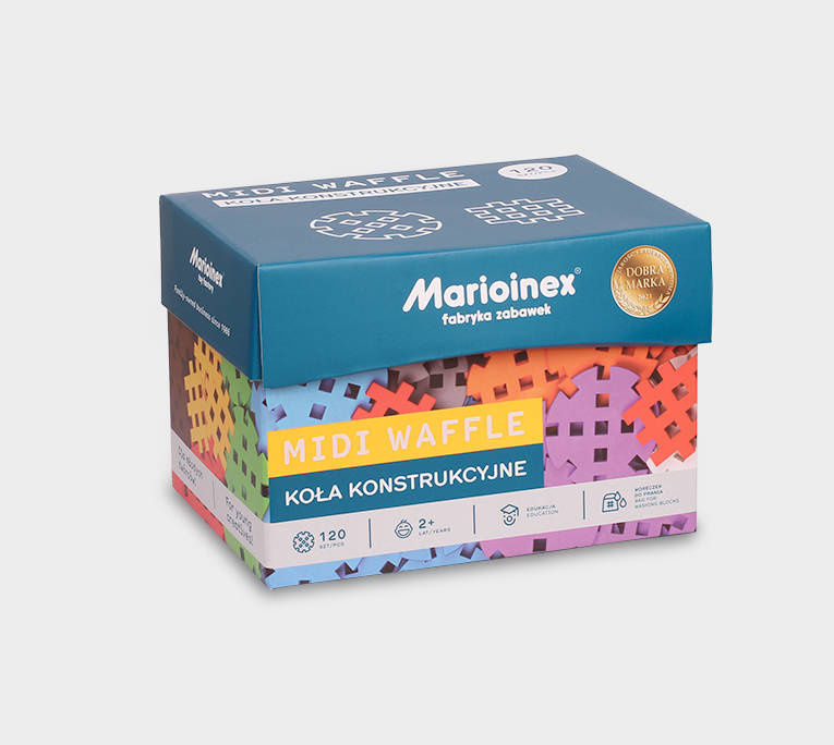Seria klocków Midi Wafle to nieco większa odmiana klocków Mini Wafle. Zestaw Midi Koła Konstrukcyjne liczy aż 120 elementów w 10 kolorach. Jest to fantastyczny pomysł na urozmaicenie zabawy dziecku, ponieważ zestaw ten łączy się z każdym innym z serii klocki Midi Wafle. Klocki Marioinex, dzięki specjalnie zaprojektowanej formie łączą się ze sobą na różne sposoby dając nieograniczone możliwości konstrukcyjne. Całość zestawu została zapakowane w estetyczne, trwałe pudełko kartonowe, a oprócz tego w zestawie pojawił się także specjalny woreczek, przeznaczony do mycia klocków w zmywarce. Fantastyczna alternatywa na utrzymanie czystości w dziecięcych zabawkach.