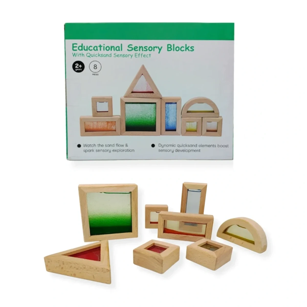 • Kolorowy piasek powoli opada przez przezroczyste okienka każdego z 8 drewnianych klocków – hipnotyzujący efekt wycisza i skupia uwagę. Zestaw w stylu Montessori z 8 kształtami geometrycznymi wspiera rozwój sensoryczny dzieci od 2 lat