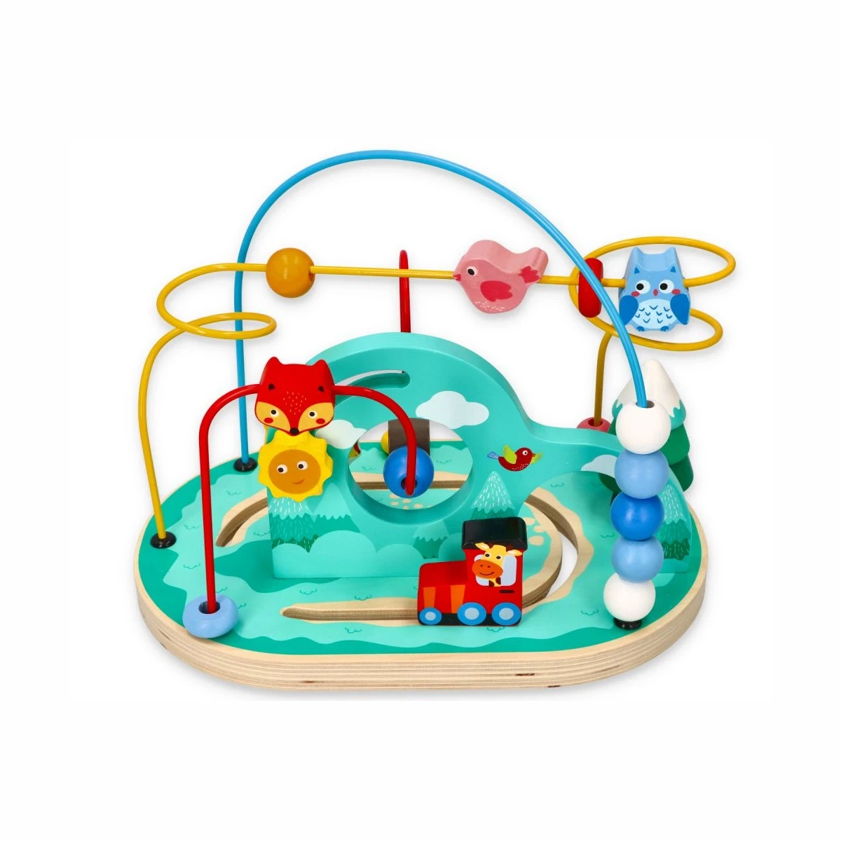 Pętla ma 3 metalowe prowadnice z 15 koralikami i figurkami, obracające się słoneczko, jelonka i drzewko na sznureczkach oraz ruchomą żyrafkę w wagoniku.