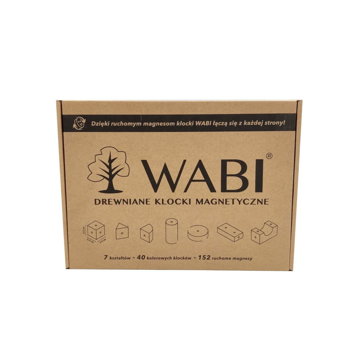 - Drewniane klocki magnetyczne WABI: 40 klocków w 7 kształtach i 5 kolorach, z 3 książeczkami modeli, całość w praktycznym pudełku. Dzięki 152 ruchomym magnesom klocki łączą się z każdej strony, rozwijając wyobraźnię i zdolności manualne dzieci.