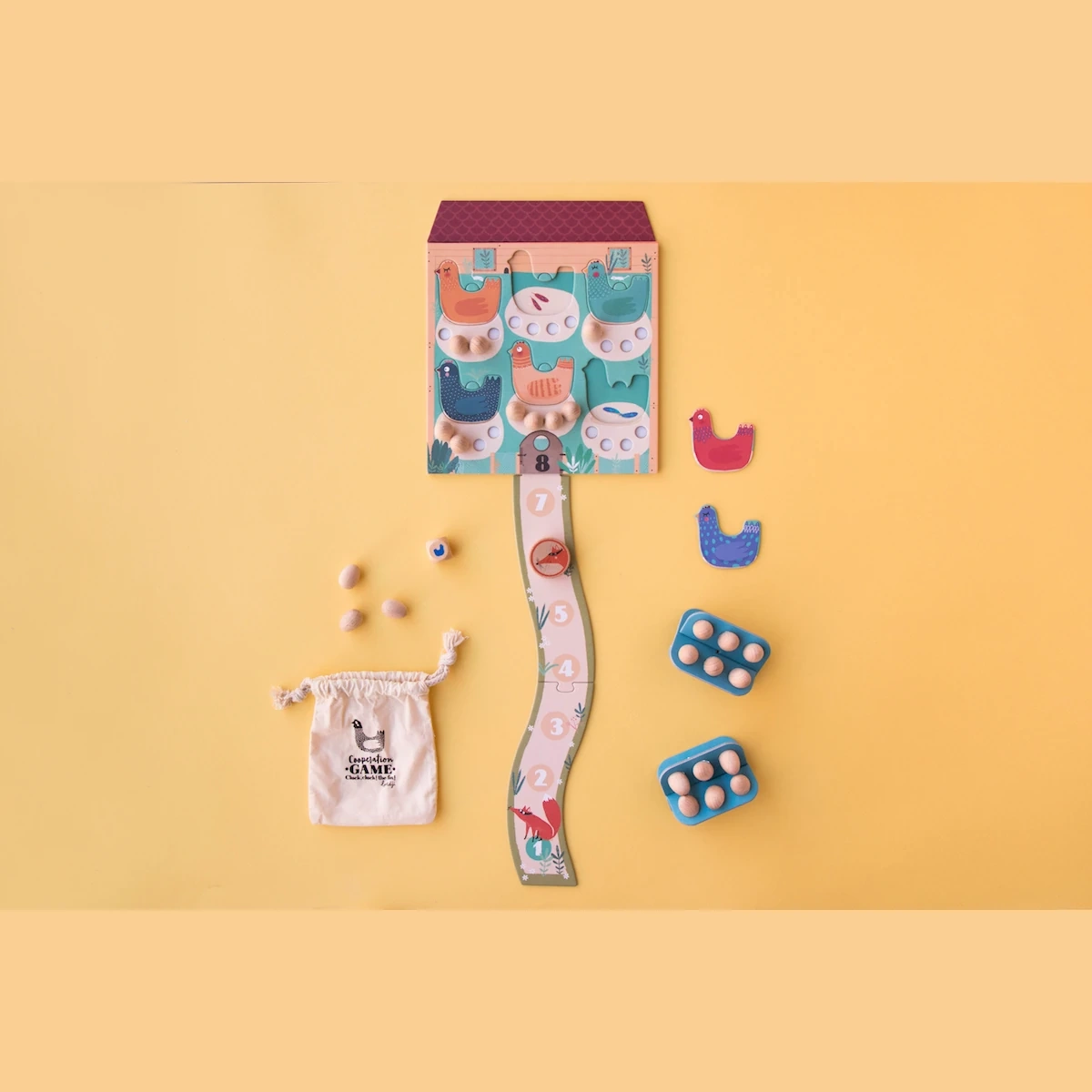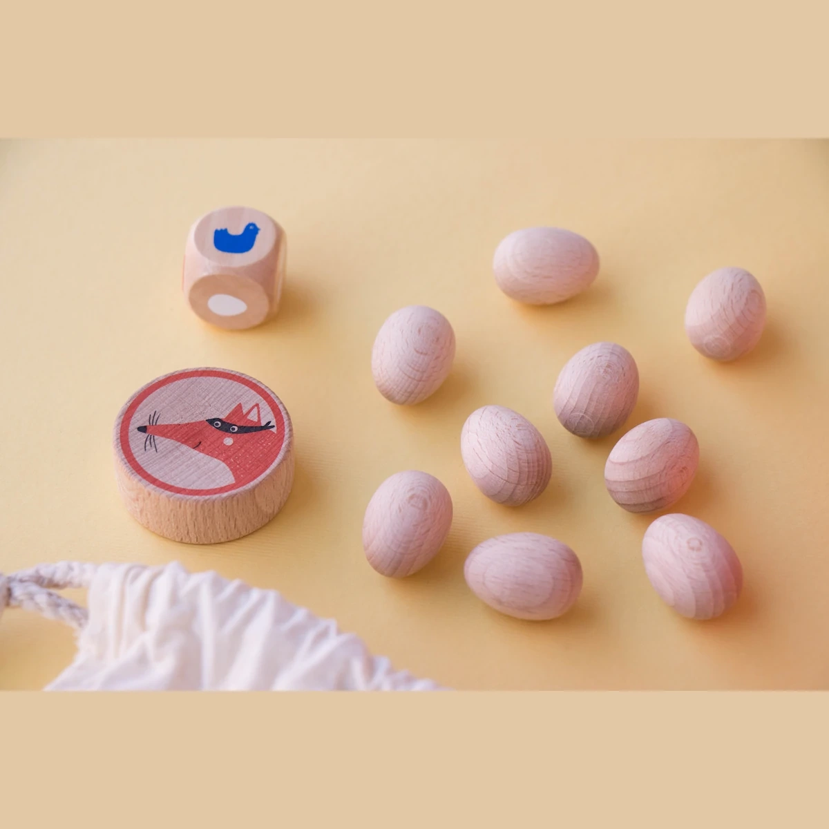 - Liczba elementów: 1 plansza, 6 kur, 24 jajka drewniane, 4 opakowania na jajka, 1 figurka liska, 1 kostka