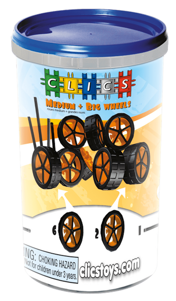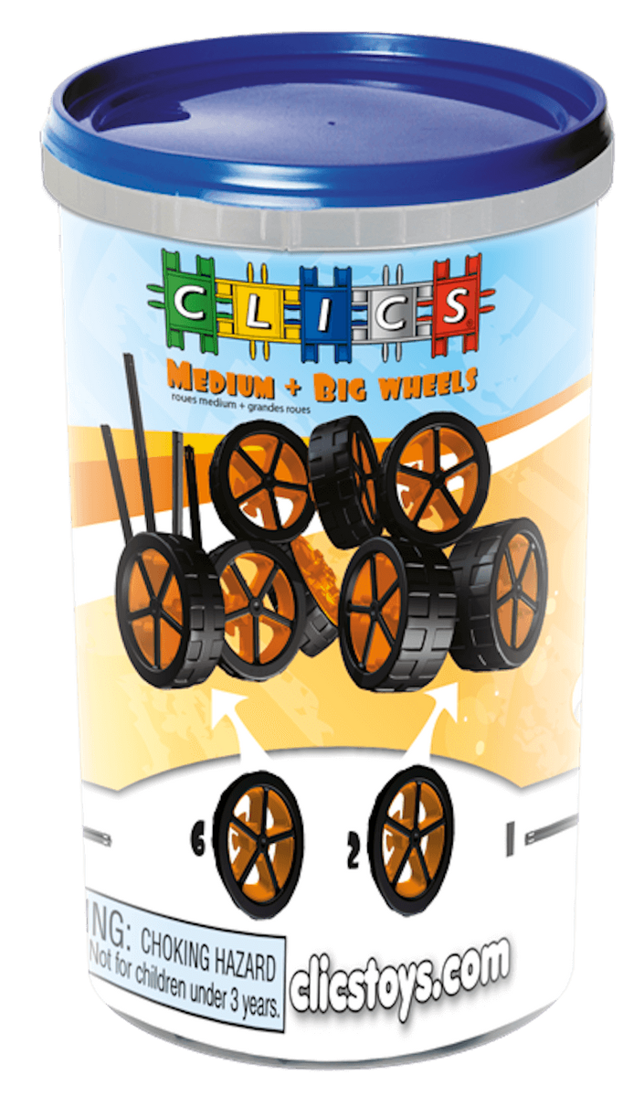Potrzebujesz kół do konstrukcji Clics? Tuba Mix to 150 elementów z małymi i dużymi kołami! Idealne do budowy pojazdów wszelkiego rodzaju — od małych samochodów po wielkie ciężarówki. Zabawka edukacyjna rozszerzająca możliwości budowania.