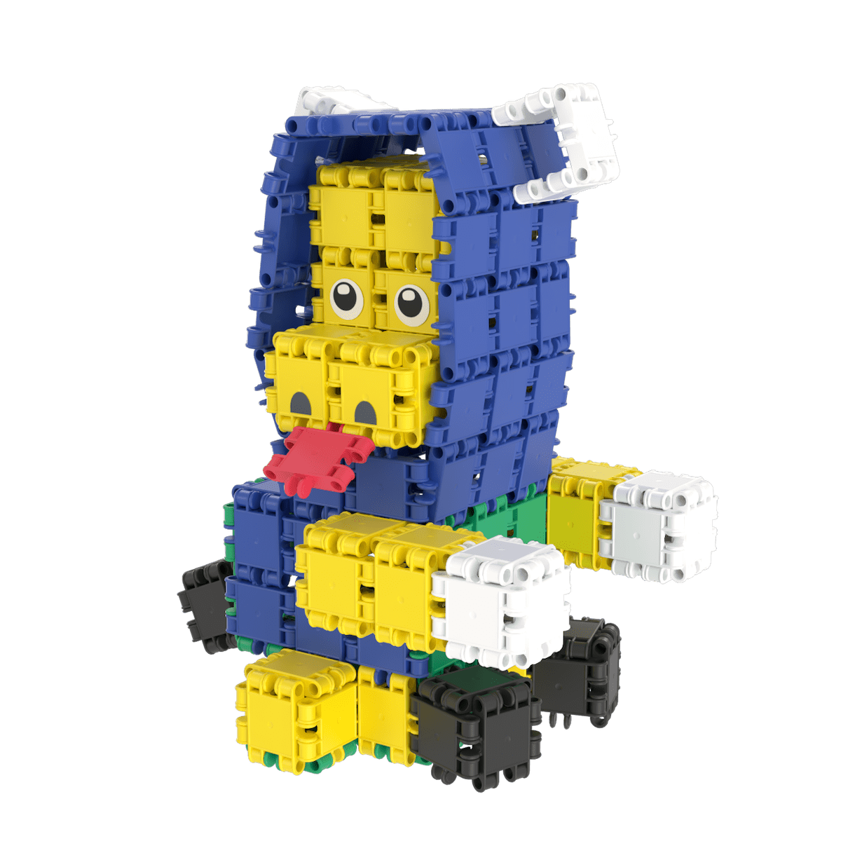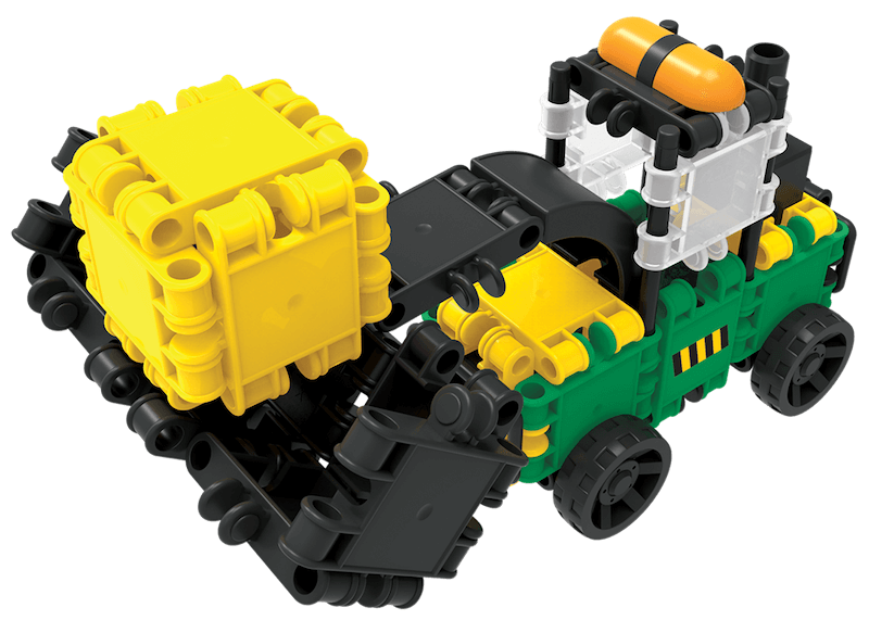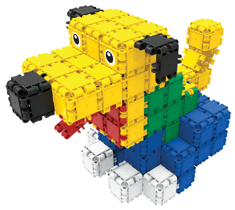 275 elementów konstrukcyjnych w różnych kolorach i kształtach. Duże wiaderko z uchwytem, instrukcja do budowy 10 modeli, naklejki. Elementy o rozmiarze 5x5 cm.
