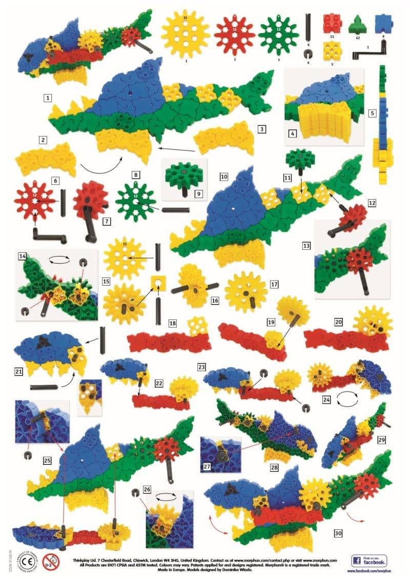 - Zestaw 200 kolorowych elementów z kołami zębatymi i ruchomymi częściami, dzięki którym Twoje dziecko zbuduje rekina, krokodyla oraz własne modele wodnych stworzeń – klocki Morphun Gearphun rozwijają wyobraźnię techniczną przedszkolaka od 4 lat