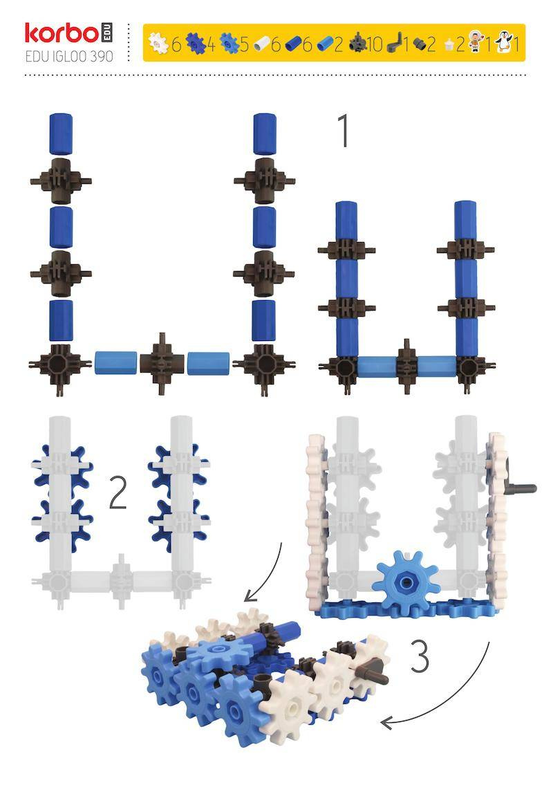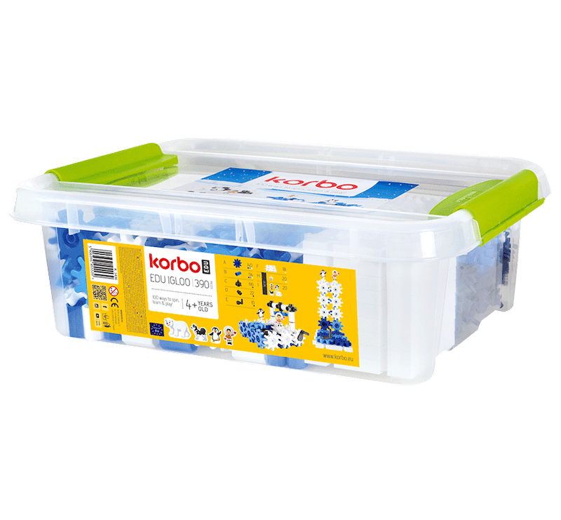 Czy Korbo jest kompatybilne z innymi seriami? Tak – elementy z serii Edu Igloo 390 łączą się ze wszystkimi zestawami Korbo, co pozwala rozbudowywać kolekcję.