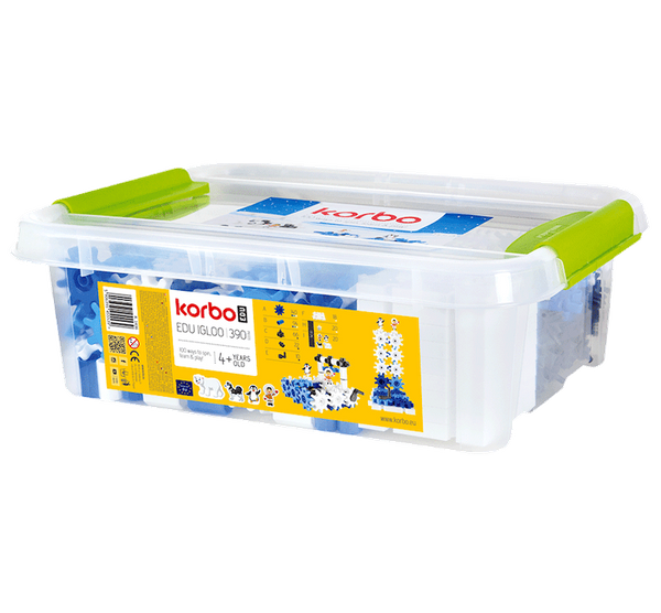 Klocki konstrukcyjne Korbo Edu Igloo 390 to zębaty zestaw konstrukcyjny dla dzieci od 4 lat, który przenosi młodego budowniczego w lodową krainę Arktyki. 390 elementów i 20 figurek polarnych rozwija wyobraźnię przestrzenną.