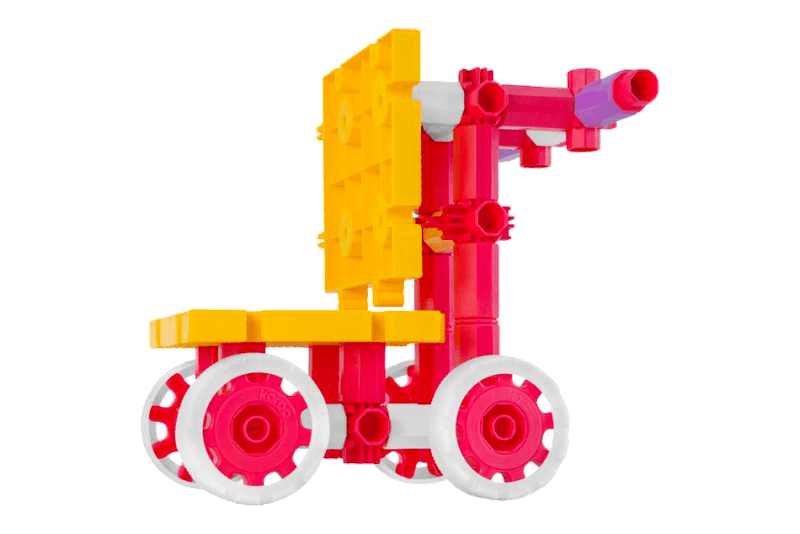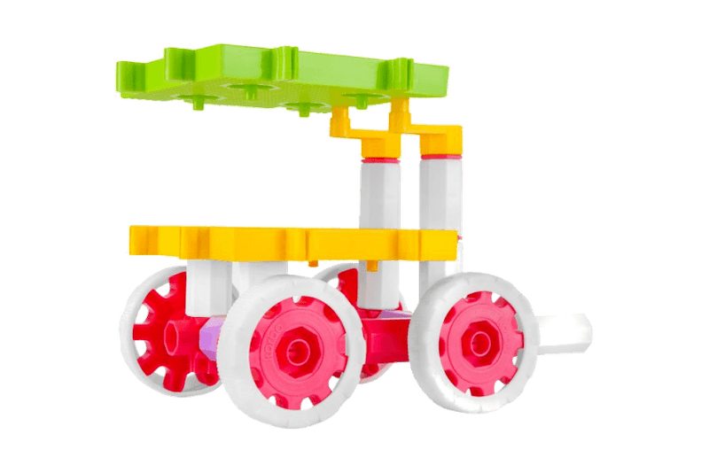 - Pastelowy zestaw konstrukcyjny z 370 elementami, w tym 20 platformami i 20 oponami, pozwala tworzyć ruchome pojazdy, karuzele i huśtawki. Koła zębate ożywiają budowle, a żywe barwy wspierają kreatywność oraz motorykę dziecka od 4 lat.