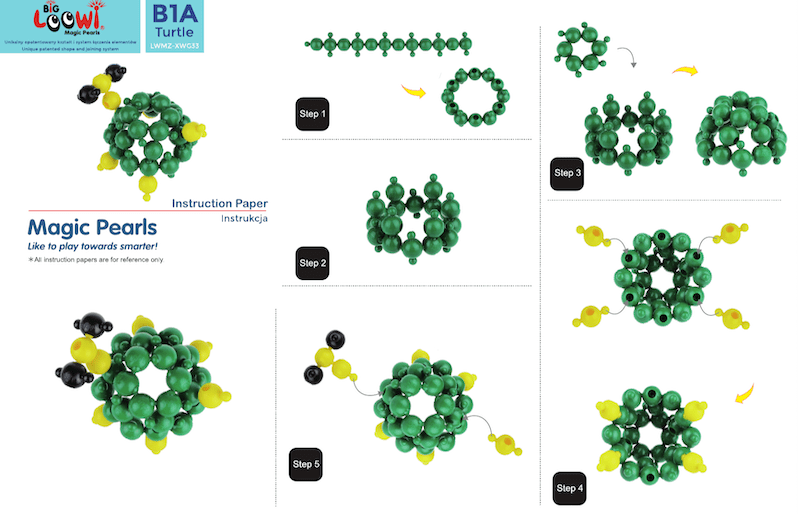 Kiedy dzieci po raz pierwszy sięgają po klocki Loowi, od razu widać zaangażowanie — kulki łączą się prostym kliknięciem, a konstrukcja rośnie w oczach. W pudełku znajdziesz 200 elementów: mniejsze kulki Loowi 55 mm, większe Big Loowi 75 mm, łączniki oraz koła. Do zestawu dołączono 10 kolorowych instrukcji w formacie A4, które stanowią punkt startowy dla pierwszych projektów.