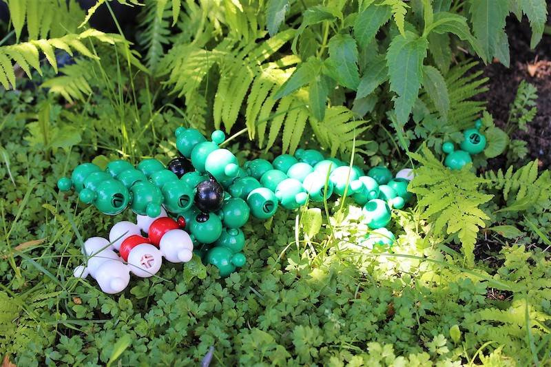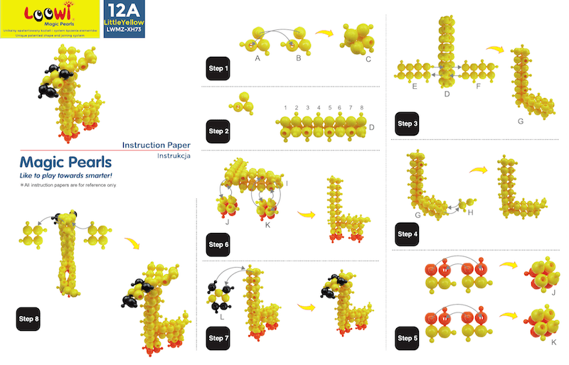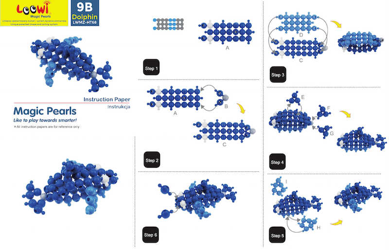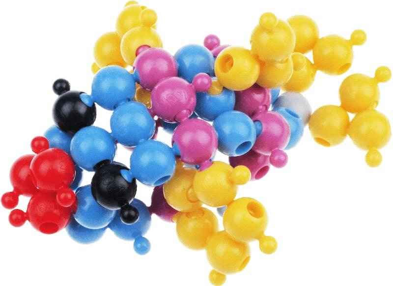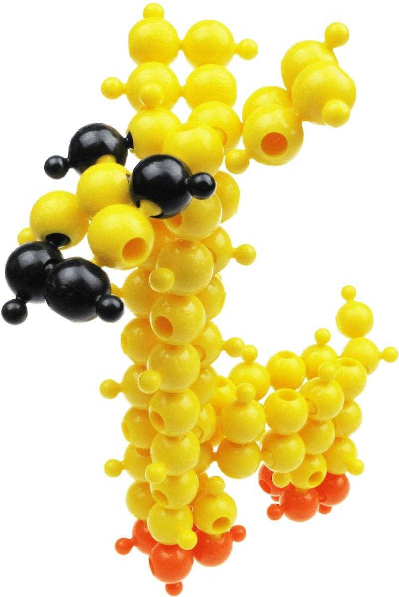 Co zawiera zestaw? 308 elementów kulkowych w kilku kolorach, 10 instrukcji A4 i pojemnik z rączką.