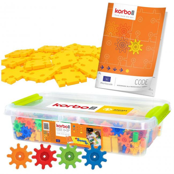 Klocki Korbo EDU Code 420 el. to zestaw edukacyjny dla dzieci od 4 lat, który wprowadza w świat programowania offline – bez komputera i robota. Zawiera 420 dużych klocków, 40 platform i książkę z 82 stronami scenariuszy lekcji.
