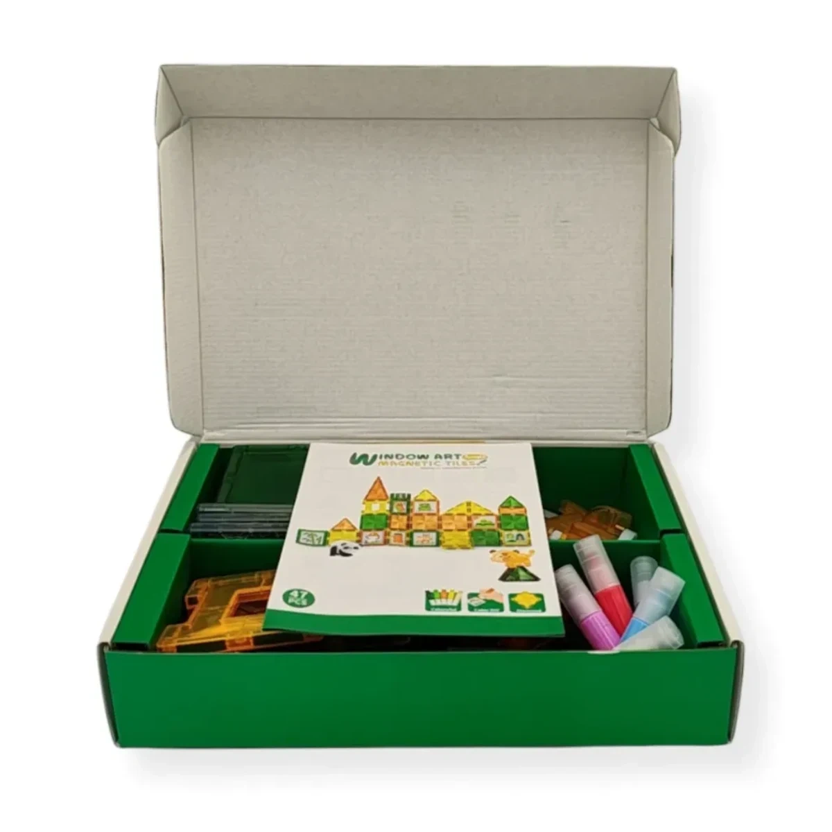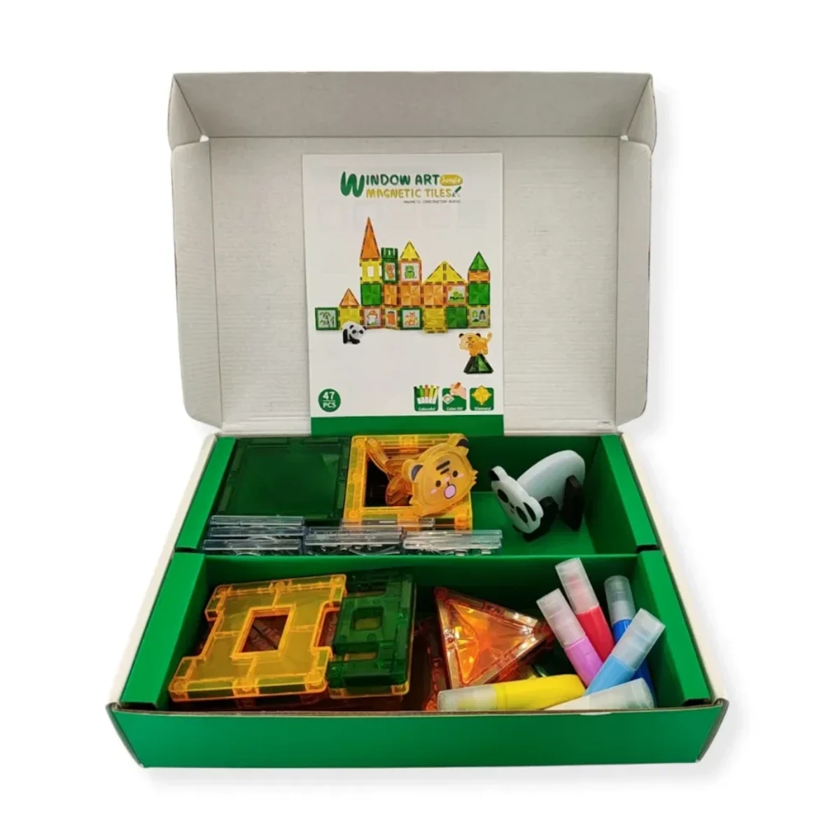 • Przezroczyste klocki magnetyczne dla dzieci Window Art Dżungla to rewelacyjny zestaw 47 elementów łączący konstrukcję 3D z kreatywnością artystyczną. W zestawie flamastry i szablony do malowania oraz figurki zwierząt dżungli, które ożywią każdą budowlę.
