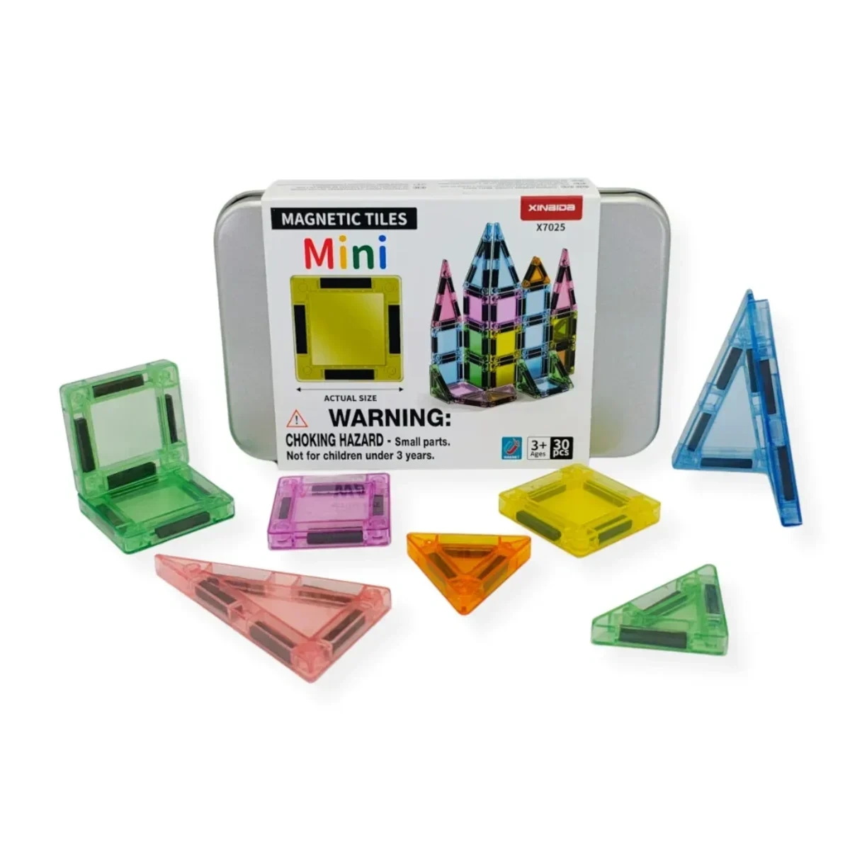 Klocki magnetyczne Magnetic Tiles Mini to zestaw 30 magnetycznych płytek geometrycznych dla dzieci od 3 lat, stymulujący wyobraźnię przestrzenną i motorykę małą. Półprzezroczyste elementy z bezpiecznego plastiku w 7 ładnych barwach przechowywane są w eleganckiej metalowej puszce – gotowej do zabrania w podróż.