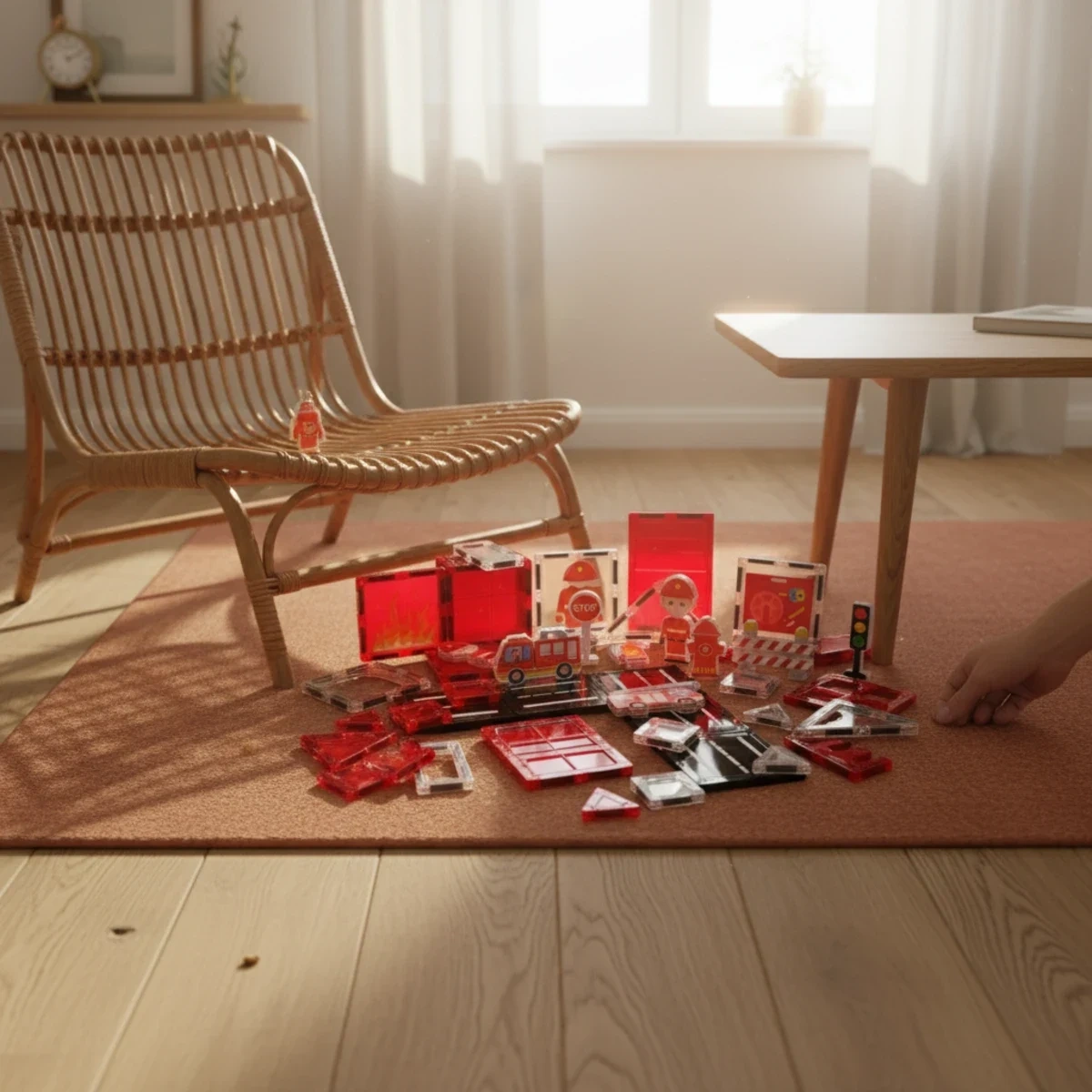 Klocki magnetyczne straż pożarna to zestaw 48 elementów dla dzieci od 3 lat, łączący budowanie 3D z odgrywaniem ról. Czerwone płytki ABS z wbudowanymi magnesami i bogate wyposażenie fabularne tworzą kompletną remizę strażacką.