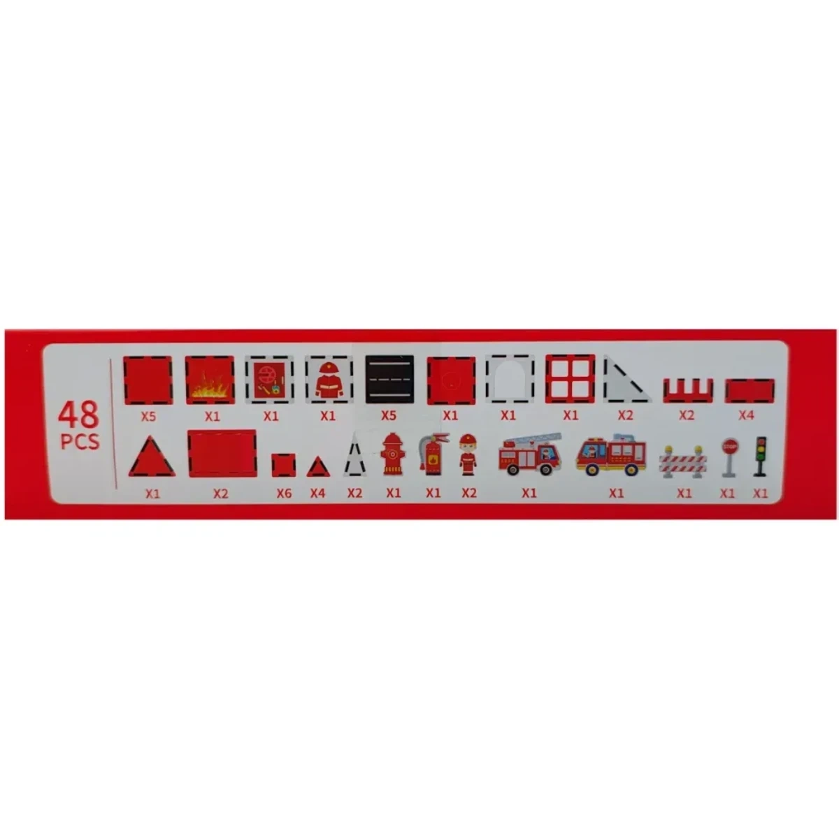 48 elementów: płytki magnetyczne (kwadraty, trójkąty, prostokąty, trapez, okna, schody, płytki-drogi), 2 figurki strażaków, 2 wozy strażackie, hydrant, gaśnica, sygnalizator, znak STOP i barierka.