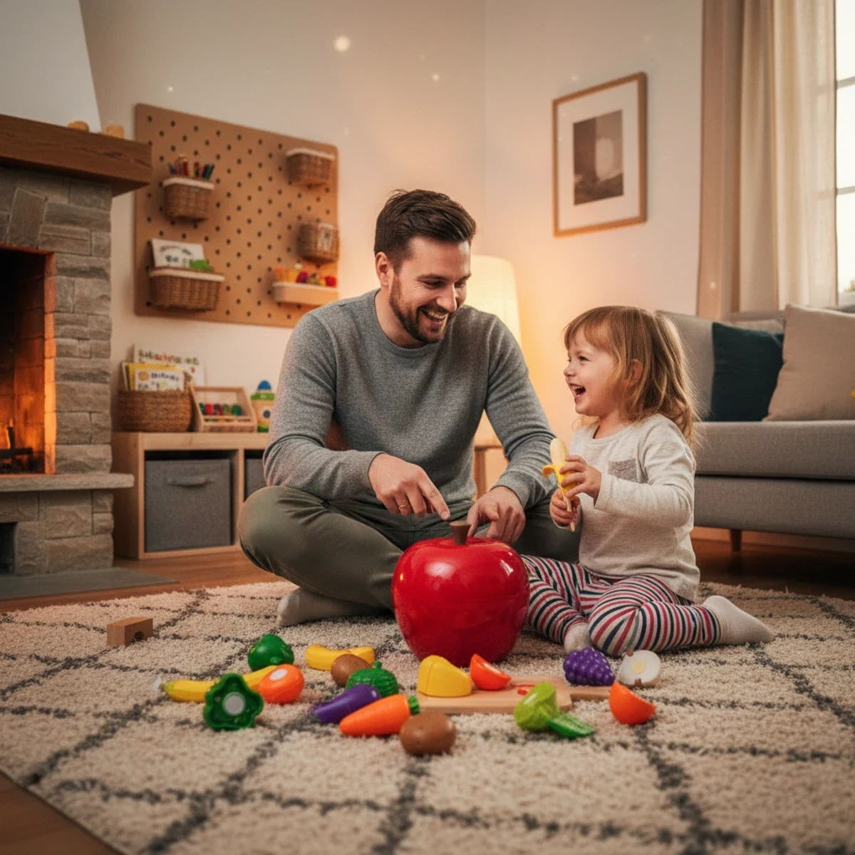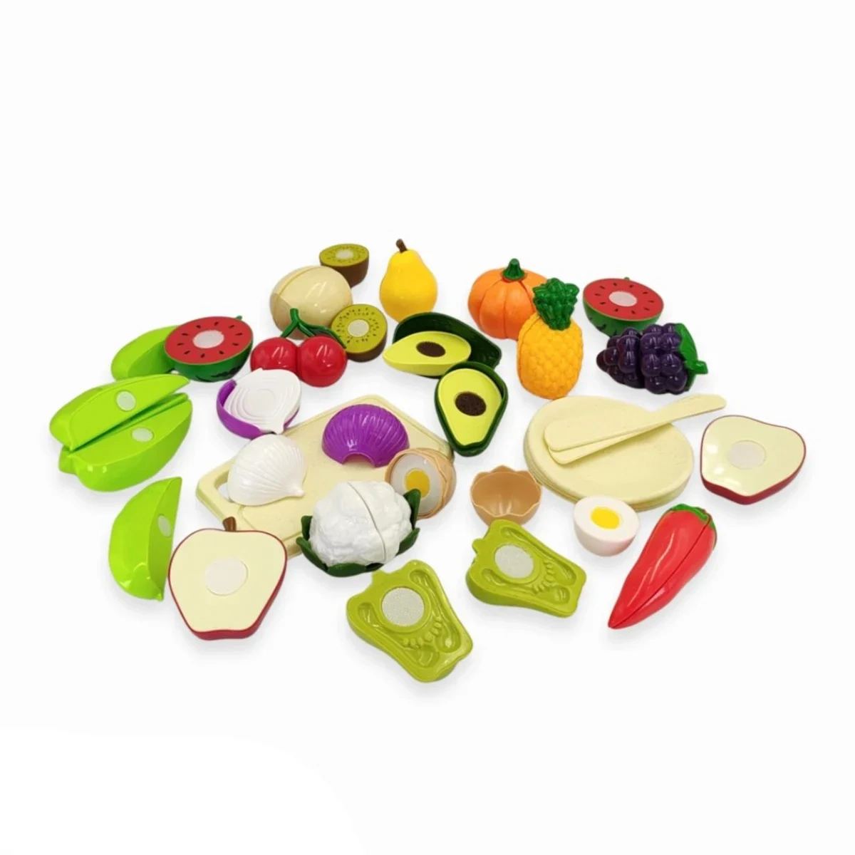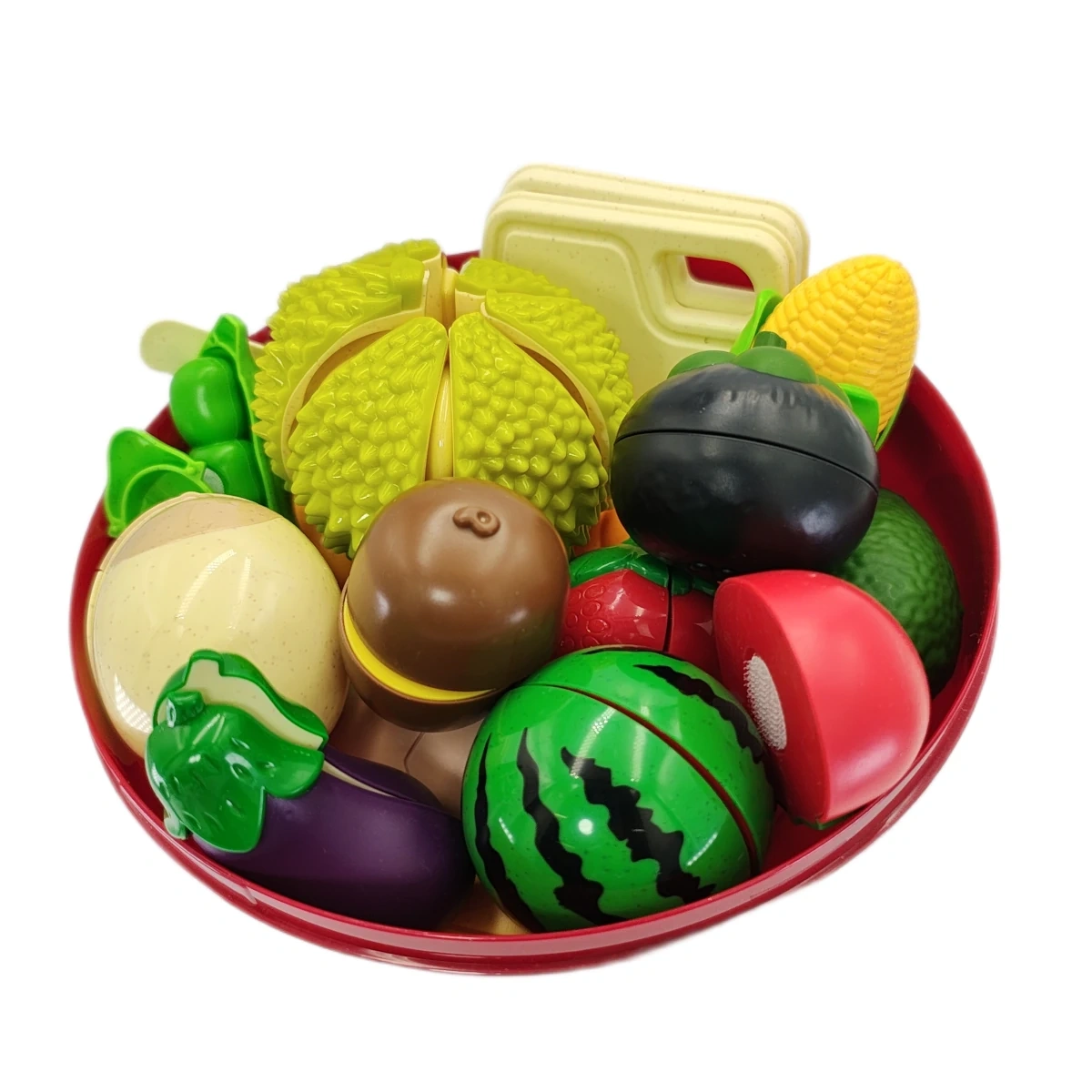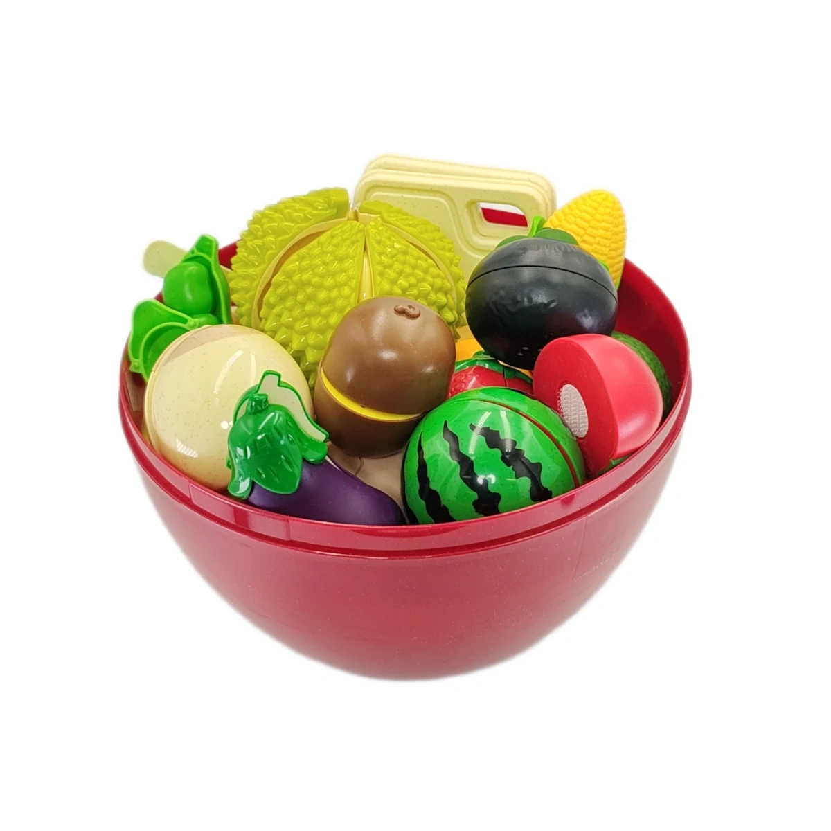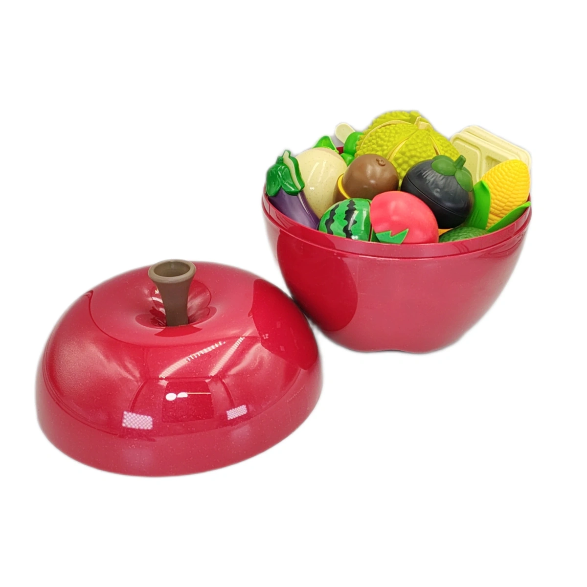 Co zawiera zestaw? 29 elementów owoców i warzyw w 6 kolorach, czerwony pojemnik-jabłko do przechowywania.