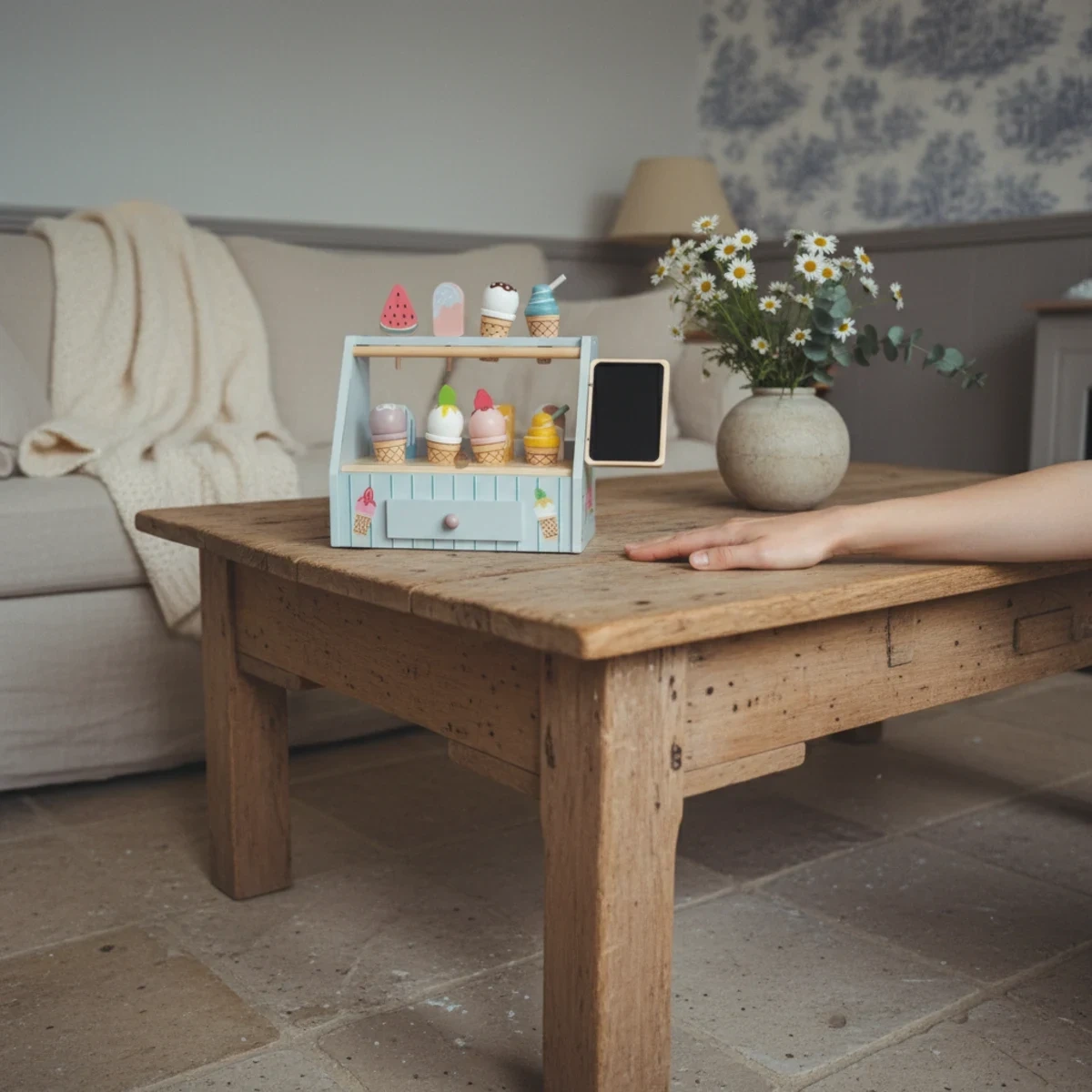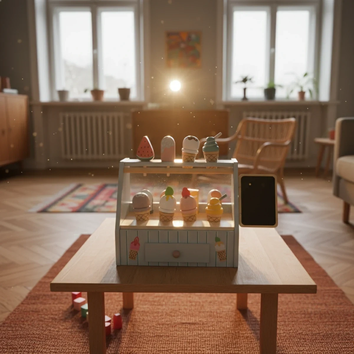 - Kolorowy drewniany sklepik z lodami z tabliczką kredową, wysuwaną szufladą i górną półką ekspozycyjną — bogaty zestaw ponad 20 elementów, który rozwija wyobraźnię, motorykę małą i umiejętności społeczne u dzieci od 3 lat.