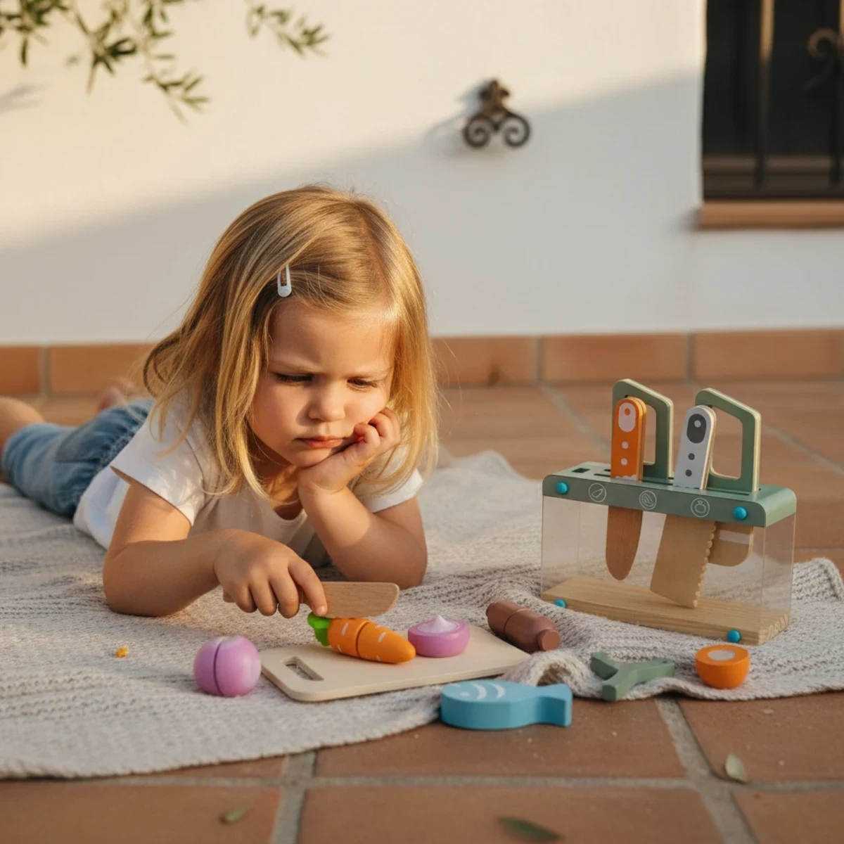 Czy zestaw rozwija motorykę małą? Tak – precyzyjne krojenie warzyw na desce, układanie noży w stojaku i „ostrzenie" narzędzi doskonalą koordynację wzrokowo-ruchową i zręczność palców u dzieci od 3 lat.